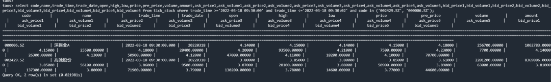 select code,name,trade_time,trade_date,open,high,low,price,pre_price,volume,amount,ask_price1,ask_volume1,ask_price2,ask_volume2,ask_price3,ask_volume3,ask_price4,ask_volume4,ask_price5,ask_volume5,bid_price1,bid_volume1,bid_price2,bid_volume2,bid_price3,bid_volume3,bid_price4,bid_volume4,bid_price5,bid_volume5 from tick_stock where trade_time >='2022-03-18 09:30:00' and trade_time <='2022-03-18 09:30:02' and code in ('002429.SZ', '000006.SZ')