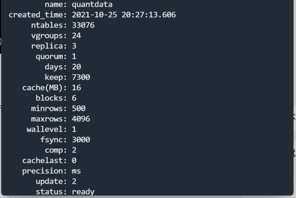 根据不同类型的业务,我们创建了 7 张不同的超级表,子表数量为 33,076 张,目前我们导入的数据总量已经达到了 46 亿之多,其中最大的一张超级表达到了 26 亿行,实际磁盘占用大概在 130GB 左右。表的列数如下图"columns"所示,数据类型以 Float 为主。