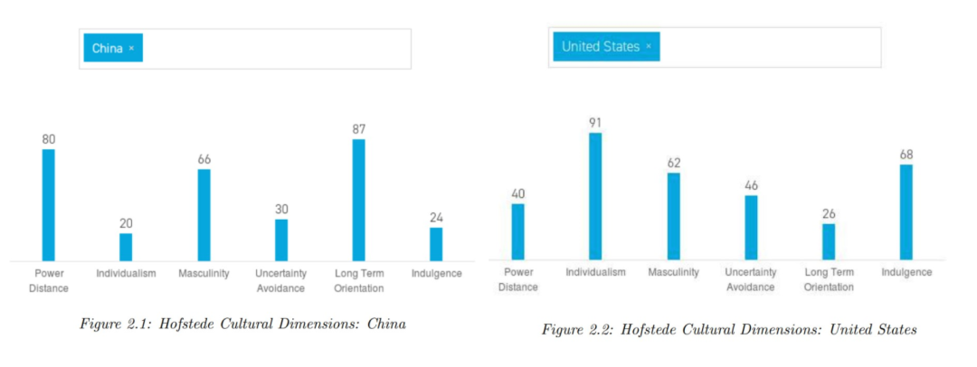 前面提到的 Sharan Foga 的论文里,用到了霍夫斯泰德文化维度理论(荷兰心理学家吉尔特·霍夫斯泰德提出的用来解释不同国家文化差异的理论框架)的分析模型。其中对中美文化的对比很有意思。我们可以看得出来相比于美国人,中国人更相信权威、更融入集体、更注重人际关系,重视合作,照顾弱者和生活的品质、更灵活变通接受不确定性、更重视长期价值以及更能控制自身欲望。