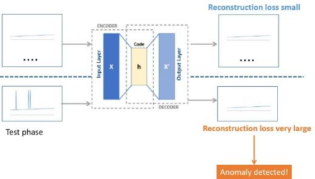 生成对抗神经网络( GAN )与 自编码器 ( Autoencoder )是两种典型的生成模型。下图是自编码器在异常检测领域的原理图[4]:先通过最小化重建损失(reconstruction loss)训练自编码器,从正常的数据中学到正常的模式;在测试阶段,当出现异常数据时,模型仍将它视作正常,此时对比输入与输出后得到的重建损失值非常高。于是重建损失值可用于检测数据是否异常。