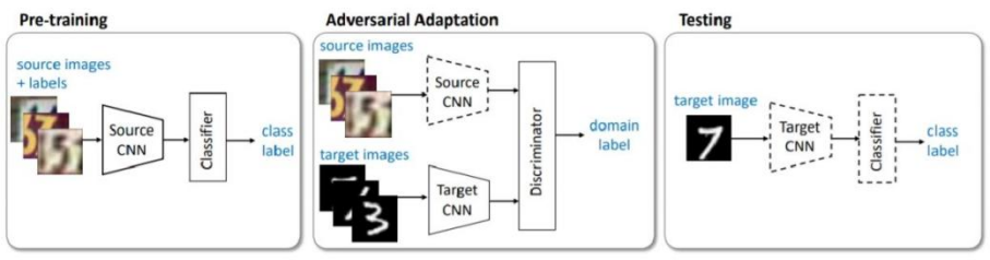 特征迁移希望算法模型学习到从源域到目标域不变的特征。一种方法是通过最大化域混淆损失使得算法模型分不清数据是来自源域还是目标域。另一种方法是基于对抗学习,下图是基于对抗学习的经典方法[3]:首先在源域上进行监督学习的训练。然后使用源域和目标域的无标签数据训练判别器,对数据进行二分类(是来源于源域还是目标域)。最后通过使用第二步中对目标域数据的特征提取器,即可以实现对于目标域数据的分类任务。