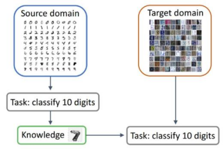 迁移学习(transfer learning)是解决分布迁移问题的有效手段。下图阐述了其思路,左侧蓝框代表源域(Source domain),指大量有标数据的数据集,如MNIST数据集;右侧橙框代表目标域(Target domain),即研究关注的存在大量无标数据的数据集, 如SVHN数据集。此处任务(Task)是在SVHN数据集上的10分类问题。迁移学习的思路是算法模型通过在源域数据集上训练(手写数字数据MNIST的10分类问题)得到的可用知识,去解决目标域的问题(门牌号码数据SVHN的10分类问题)。
