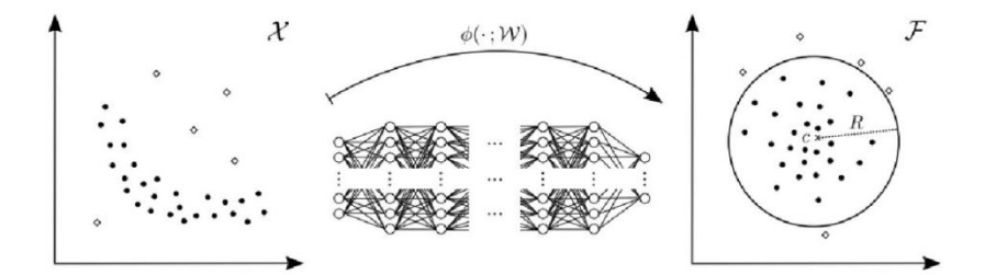 One class classification[5]训练算法学习可包围住正常数据分布的最小超平面/超球面。 下图的神经网络通过非线性变换将原始数据映射到特征空间中,算法在此特征空间中学习上述超平面/超球面;在测试阶段通过计算数据与上述模型的距离来判定该数据是否异常。