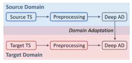 目前对于分布迁移下深度学习时间序列异常的检测研究较为有限。下图的研究思路中,首先对源域和目标域的数据进行预处理,随后在预处理后的源域数据上进行基于深度学习异常检测算法的训练,取得满意效果后,探究利用迁移学习方法把上述知识迁移到目标域的可行方案。