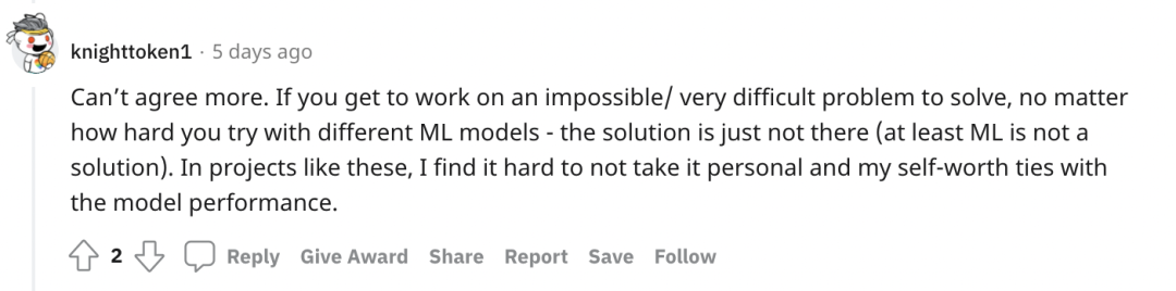 Reddit 网友 @knighttoken1 称,如果你开始解决一个不可能或者非常困难的问题,无论如何尝试使用不同的 ML 模型都不灵时(至少 ML 不是解决方案)。在这样的项目中,很难不把个人价值与模型性能联系起来。