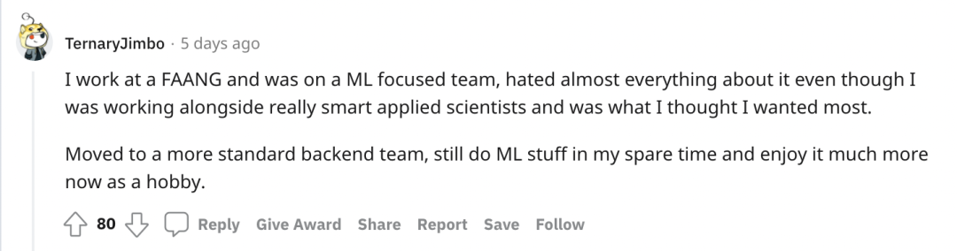 即便在大厂,只有极少数地方才会用到最前沿的ML研究,况且还是业务优先。@TernaryJimbo 提到,在大厂 ML 团队带过后,现在讨厌关于 ML 的一切,他转到了更标准化的后端工作,只是把ML当成一种业余爱好。