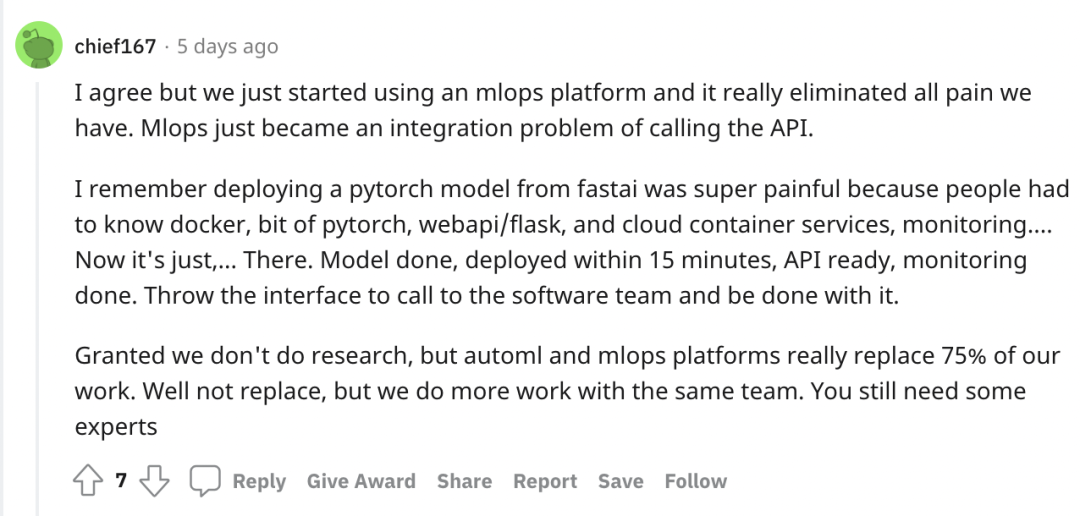 网友 @chief167 更直接,他说自己根本不喜欢 Azure、Snowflake 或 Databricks 进行部署,现在模型就绪后,使用 MLOps 平台在 15 分钟内就可完成模型部署,API 就绪,完成监控,抛出接口并完成整个过程,确实消除了所有痛苦。