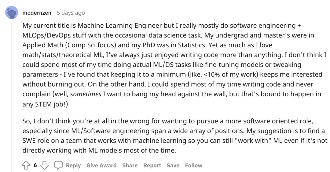 网友 @modernzen 现身说法,他目前的职位是机器学习工程师,但主要做的是软件工程 + MLOps/DevOps 的工作,偶尔还会做数据科学任务。尽管他喜欢数学/统计/理论机器学习,但一直喜欢写代码胜过任何事情。