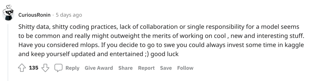 他给出的的理由是查看损失曲线、调整特征和参数的工作实在太耗费精力,太无聊,尤其是生产模型时,当它们没有产生预期的效果,他会不禁认为自己只要足够努力,模型就会变得有效,但往往事与愿违,ML 模型效果难以捉摸,项目的交付难度无形中让他压力山大,他现在很厌恶花数个小时在“垃圾数据”中撞脑袋的机器学习工作中。