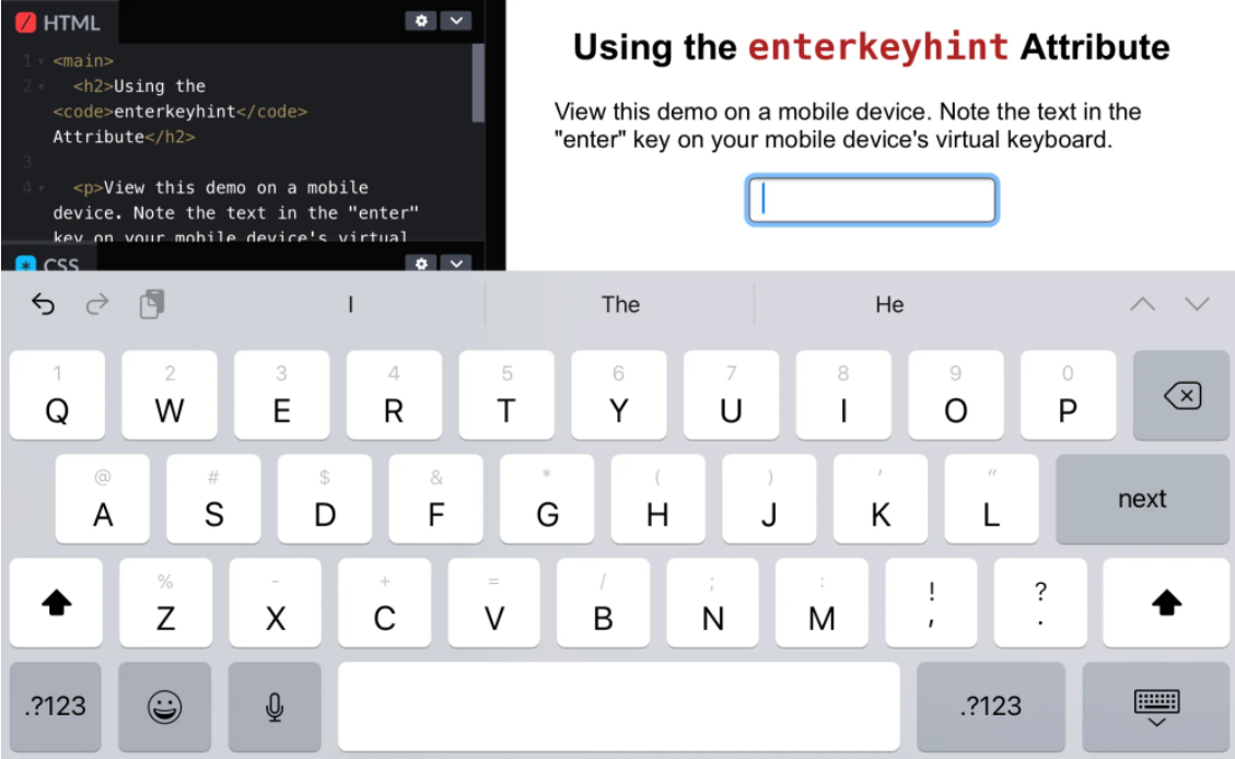 该enterkeyhint属性是一个全局属性,可应用于已contenteditable设置为的表单控件或元素true。此属性可帮助使用虚拟屏幕键盘的移动设备上的用户。