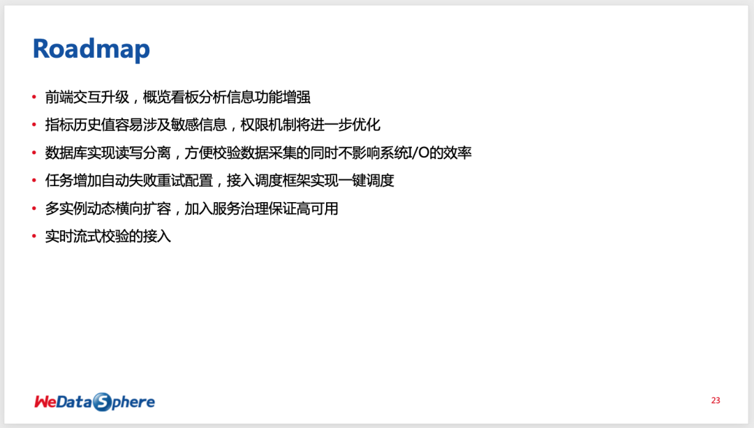 我们的数据库要实现读写分离,方便检验数据采集的同时不影响系统 IO 的效率。我们的任务会增加自动失败重试配置当前是一个手动的失败重拉。然后我们要接入轻量上的调度框架,实现一键调度。我们当前在开源的版本是必须发布到 schedulis 来完成调度。然后我们的多实例实现动态的横向扩容,加入服务治理,保证高可用,以及我们之前已经也提到过的正在做的实时流式校验的一些接入。