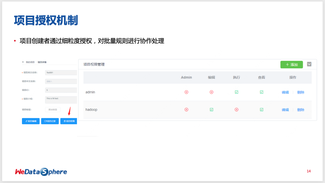 接下来的一个权限就是项目授权机制,我们的项目创建者可以通过系路的授权对该项目的下面的批量规则进行协作处理。在我们的界面上项目详情界面项我们权限这样的一个按钮,点击之后会有项目权限管理的界面,这里会帮我们show出来当前拥有项目权限的一些用户,他们是有哪些权限的