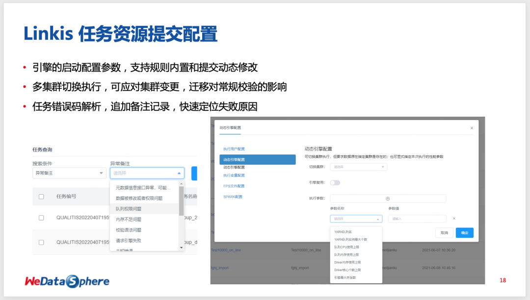 然后我们是 Linkis 任务资源提交配置的一些完善。 我们的引擎启动配置参数除了在规则内置可以编辑进去,也就是随着规则而保存,还可以在提交的时候动态修改。 我们看图片就是动态引擎配置这边有一个执行参数,它是可以实时地去替换你要跑任务的一个Yarn的队列名,还有Yarn的一些参数上线以及 Spark 的一些引擎跟 Driver 内存的一些设置。