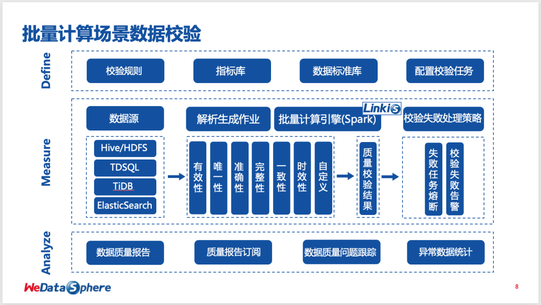 我们在进行质量检验过的质量检验结果,后续的一些校验成功或者检验失败的,处理失败的话,我们有失败任务的熔断或者失败任务的告警。在最后的分析阶段,我们会导出数据质量报告以及可订阅质量报告,自动地推送用户以及数据质量问题的跟踪,跟异常数据的一些统计。