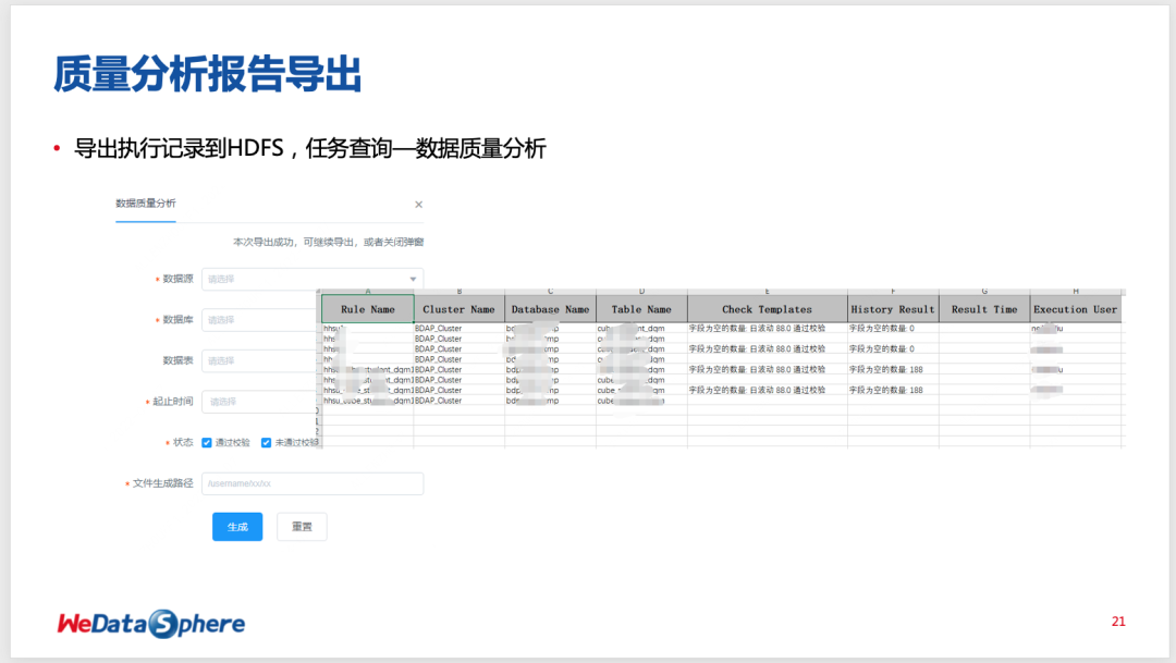 最后是我们一个质量分析报告的导出,我们的执行记录是导出到 HDFS 由我们的运维去进行查看,去跟进。然后我们在他的入口在任务查询数据质量分析,点击一个弹窗。这上面有一些你要建面的数据源库表的一些选择以及起止时间,还有它的一个状态以及文件生成路径。这里的文件生成路径就是一个 HDFS 路径,导出的文件的格式是如图所示,它有基本的规则的名称,集群名称、库表名称以及我们校验的一些模板。你是用了什么样的校验?它的结构值是多少,它的状态是多少以及我们的结果。