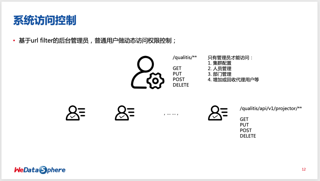 我们的 Url 以 Quality 的前缀,以 GET PUT POST DELETE 这些方法都是对管理员开放的。所以在所有的接口包括集群配置、人员管理、部门管理、增加后回收代理用户等,只有后台管理员才可以访问。对于普通用户,我们把 URL 收缩到 qualitis/api/v1/projector 这一层,给用户开放一些其他的操作,这是我们的系统访问控制。