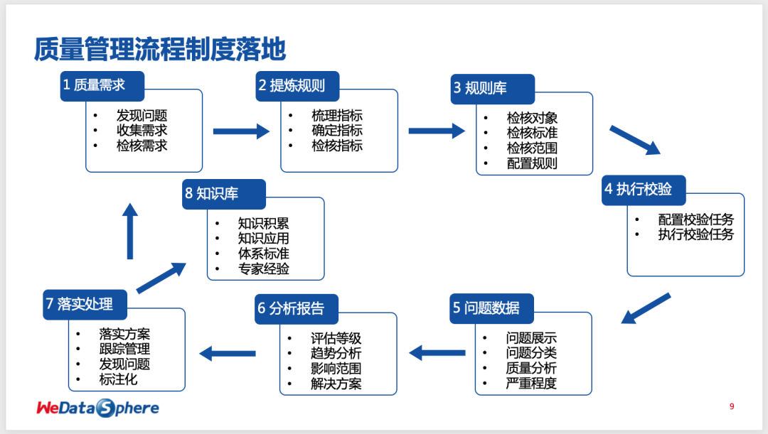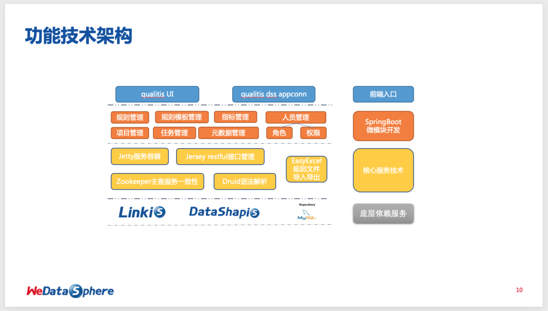 同时我们在数据参与人员中也要建立更切实的流程制度。这里第一步,以及后续的分析报告,还有后续的落实出以及生成我们数据检验知识库、知识积累、知识应用、体系标准、专家经验等。我们的技术架构是既提供独立的界面,也可配合工作流 DataSphere Studio 使用。