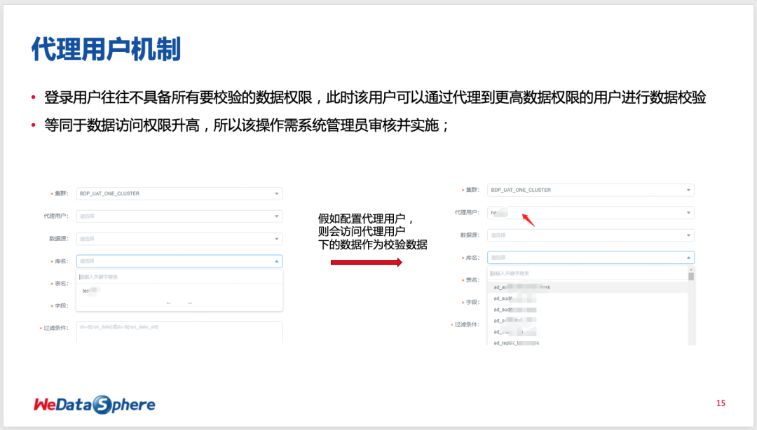接下来就是我们的代理用户机制,我们的登录用户往往是不具备所有要校验的数据权限,此时就需要我们通过代理到更高数据权限的用户进行数据质量校验。代理用户机制就等同于数据访问权限的升高,所以该操作需要系统管理员等合并实施。