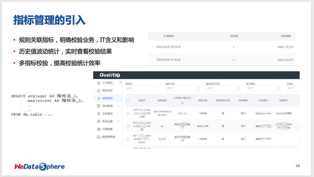 这个我会帮助我们一个检验结果来分析它的影响的范围,以及需要跟进的开发或者运维。我们的指标同时是也支持历史值的波动统计,可以实时地查看检验结果。在我们指标末端有一个操作按钮,可以查看历史值这样的一个历史值,就是指它关联的这个规则在历史跑的记录产生的一个检验结果,可以在这里实时查看。通过这样的一个历史值,我们就可以分析校验结构的一个波动。