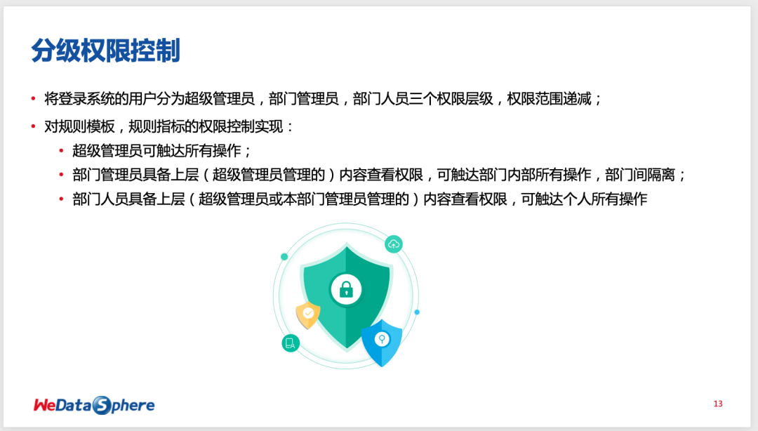 然后我们设计了一个分级的权限的控制。我们是将登录用登录系统的用户分为超级、部门管理员、部门人员三个权限等级。我们的权限范围就是依次递减,主要是对于规则模板跟规则的指标这些很敏感型的物料进行权限控制的实现。我们的超级管理员可触达所有的操作。这个比较常规。