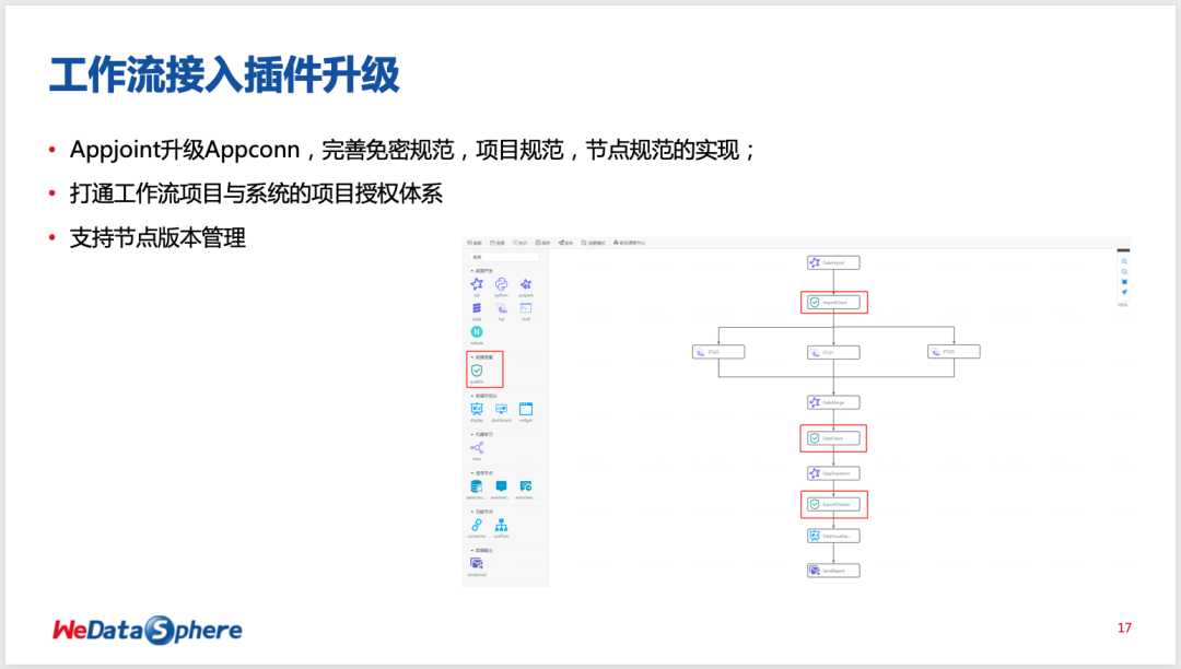 首先是工作流,我们的技术插件是由原来的 Appjoint 升级为 Appconn 我们在升级的过程当中是完善了免密规范、项目规范跟节点规范。然后我们是打通工作流项目跟系统的项目授权体系,这也跟我们项目的授权,还有工作流的一些编辑查看发布权限是打通的。然后我们是支持节点版本管理,我们的接口是 OK 的。在工作流我们可以把 query 的节点放在任何一个阶段,进行前置或者后置的一些数据校验。