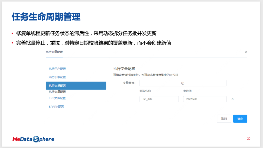 接下来是我们的任务生命周期管理。我们首先是修复了单线程更新任务状态的滞后性,采用动态拆分任务,然后并发更新。接着是完善我们任务批量停止重拉以及对特定日期校验结果的覆盖更新。我们在执行变量配置,这里可以指定一个参数,系统参数叫 run_date 参数值可以指定一个日期。然后我们的任务不管跑了多次,始终更新的都是这一个日期的结果。
