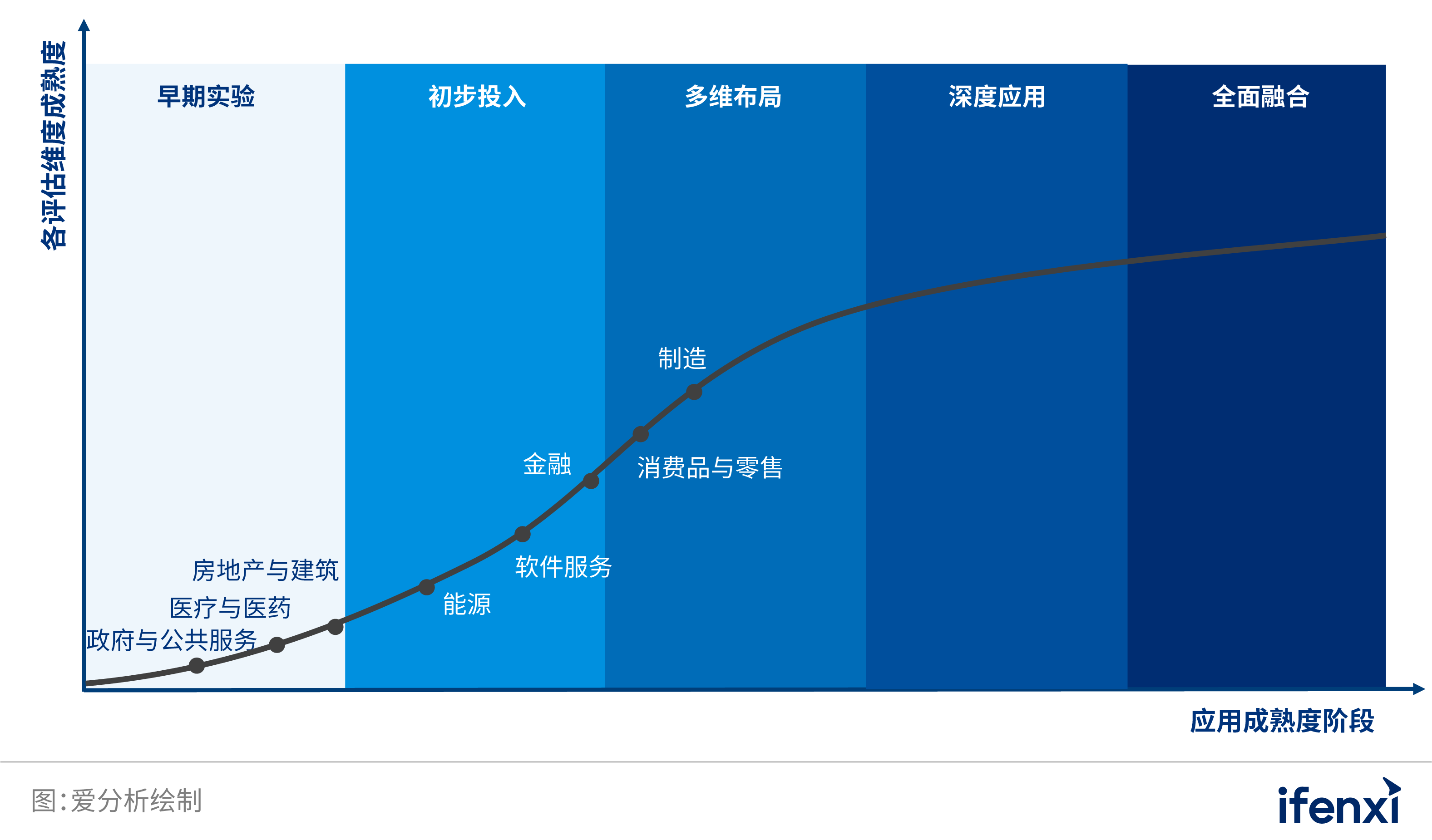 爱分析基于甲方调研、厂商调研和桌面研究,其中调研厂商数量近50家,采集了上百个低代码应用实践的代表性案例,依据当前各行业低代码应用实践中呈现的应用场景丰富度、技术应用深度以及公司在低代码方向的战略与组织人才进展等进行评估,得到金融、制造、消费品与零售、医疗与医药、房地产与建筑、政府与公共服务、能源、软件服务等行业的低代码应用成熟度,如下图所示。整体来看,大部分行业的低代码应用成熟度处于早期实验阶段或初步投入阶段,低代码应用仍处于早期发展阶段。