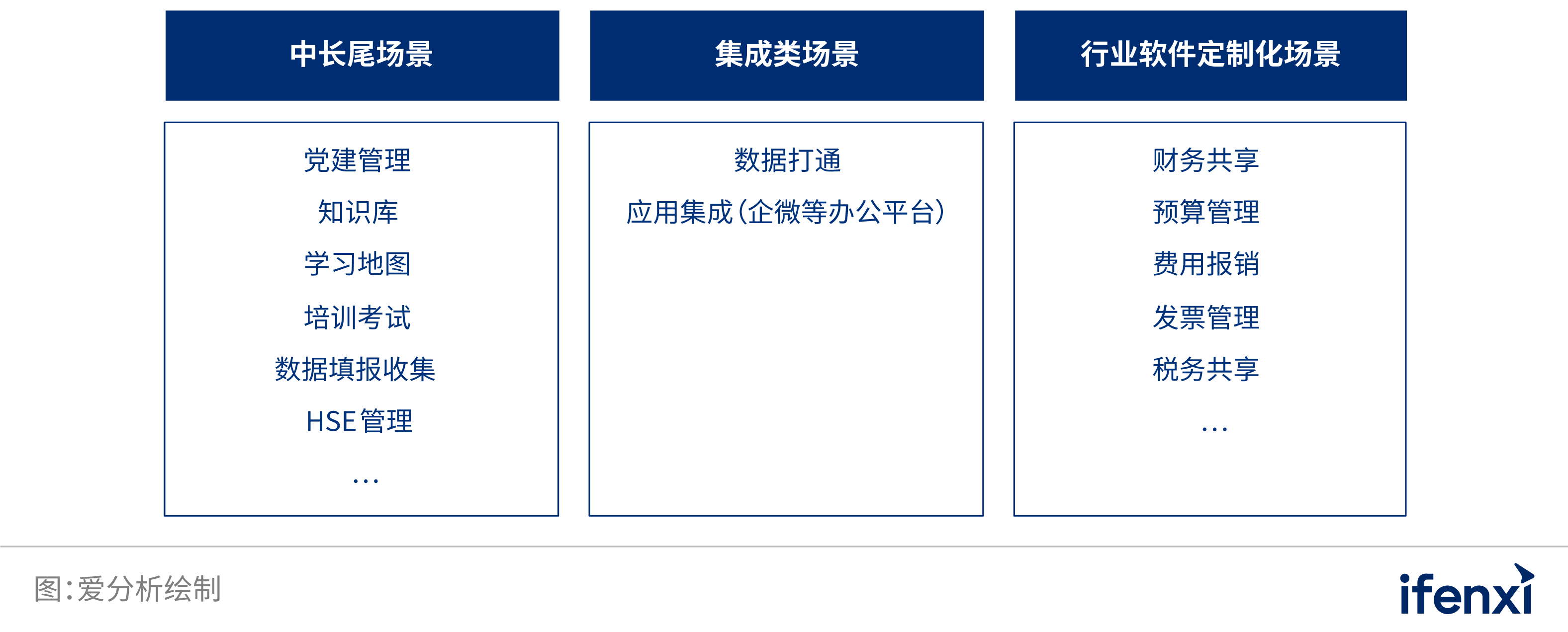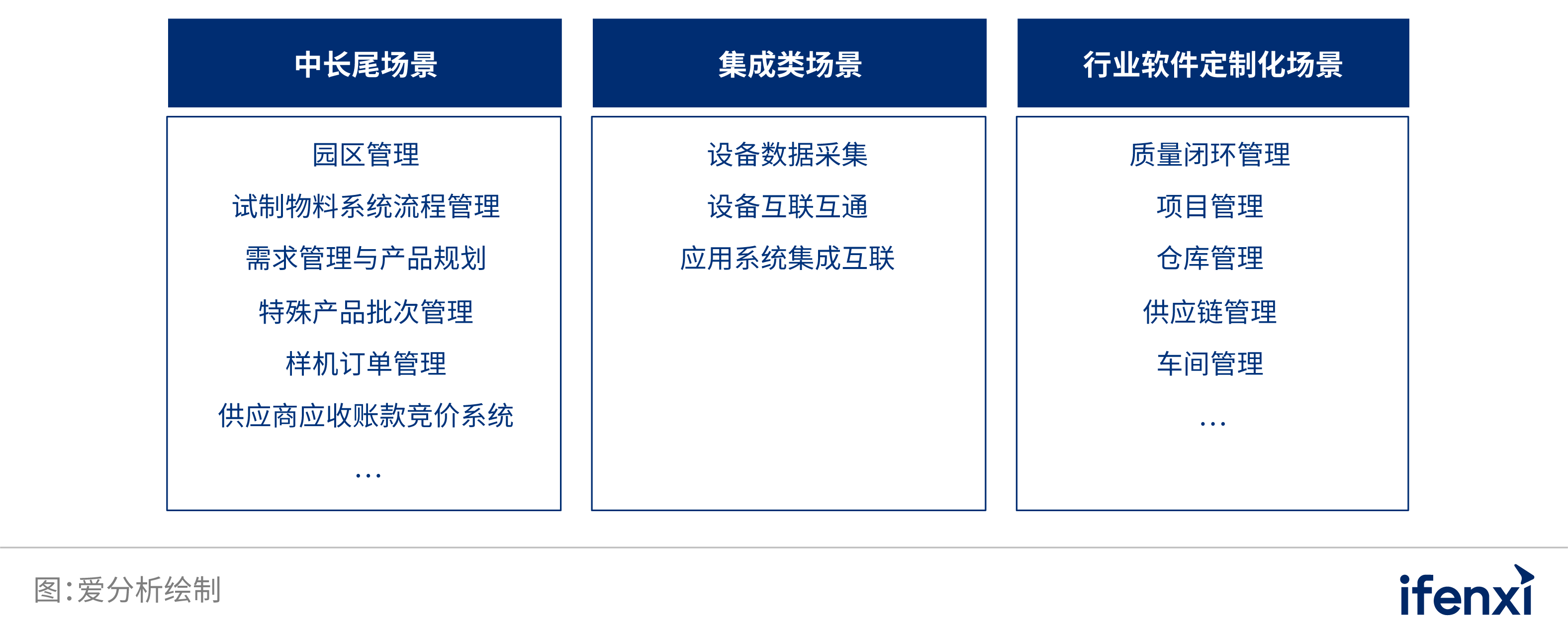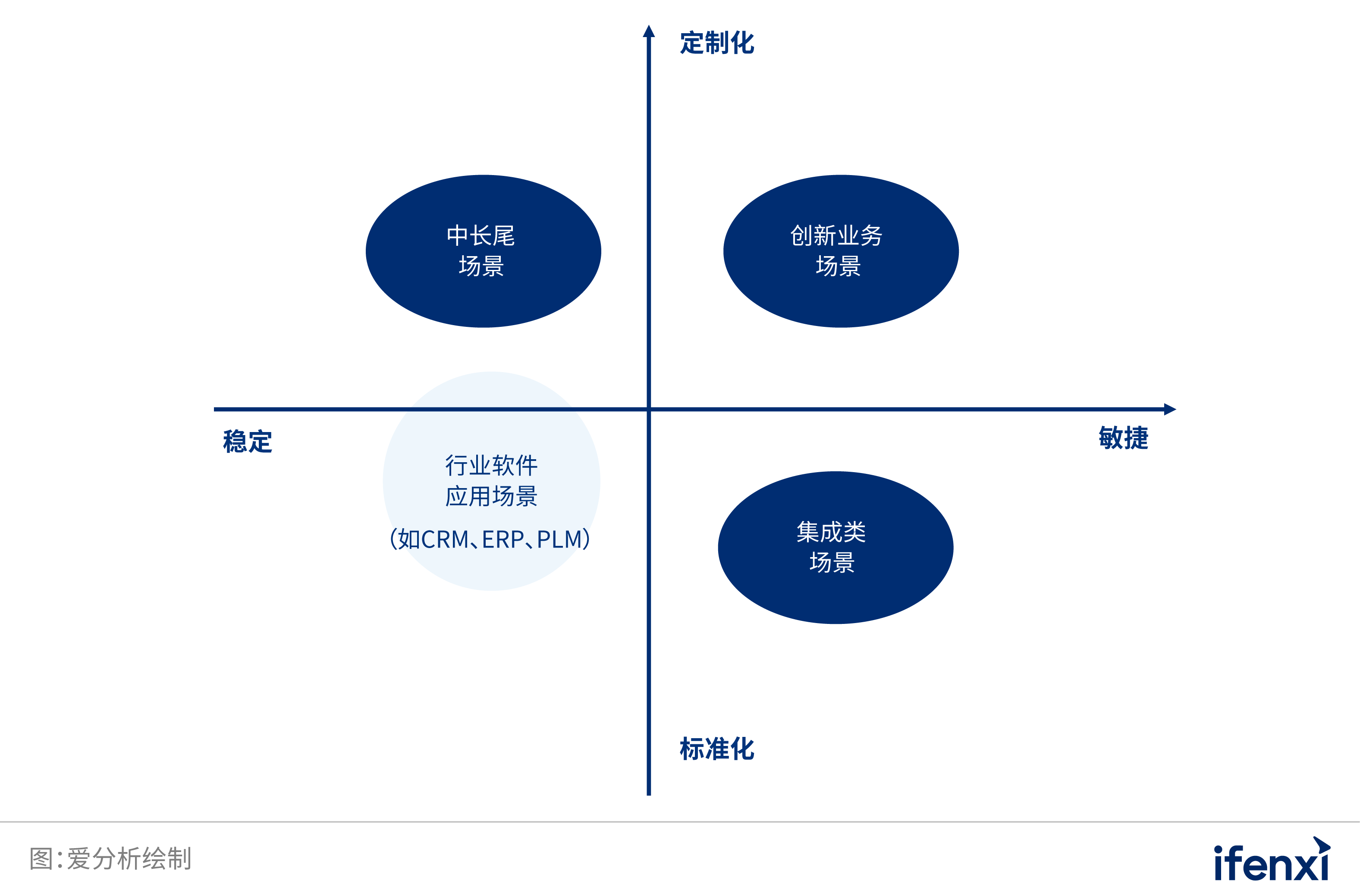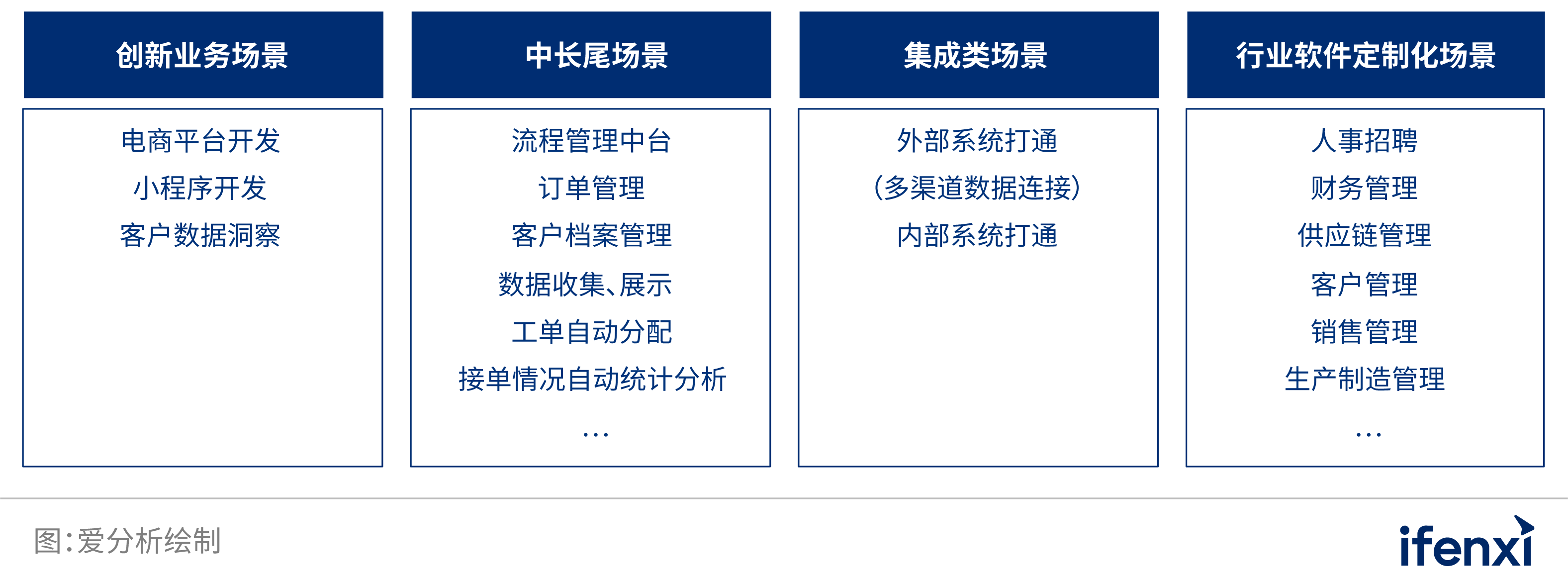 - 中长尾场景:需求多、碎片化且定制化程度高,行业标准软件产品未能满足的场景;