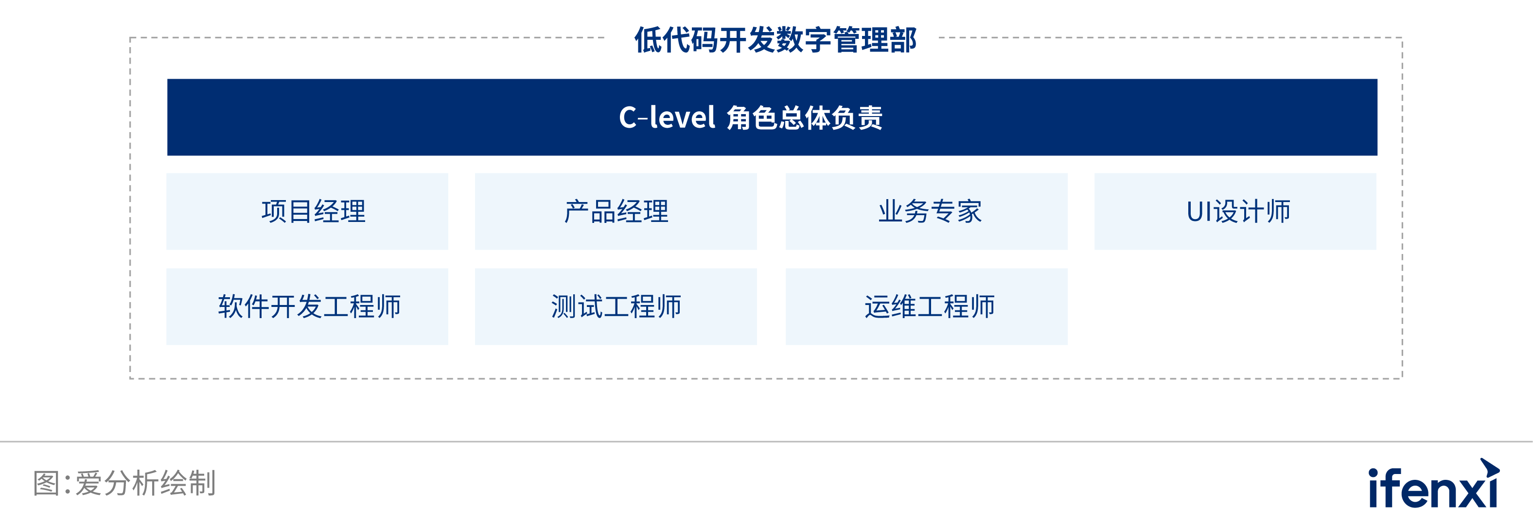 从长远发展来看,企业实现低代码的全面融合,需要建立独立的部门,由公司C-level角色担任总负责人,具备项目经理、产品经理、业务专家、软件开发工程师等一系列的专业人员配置。