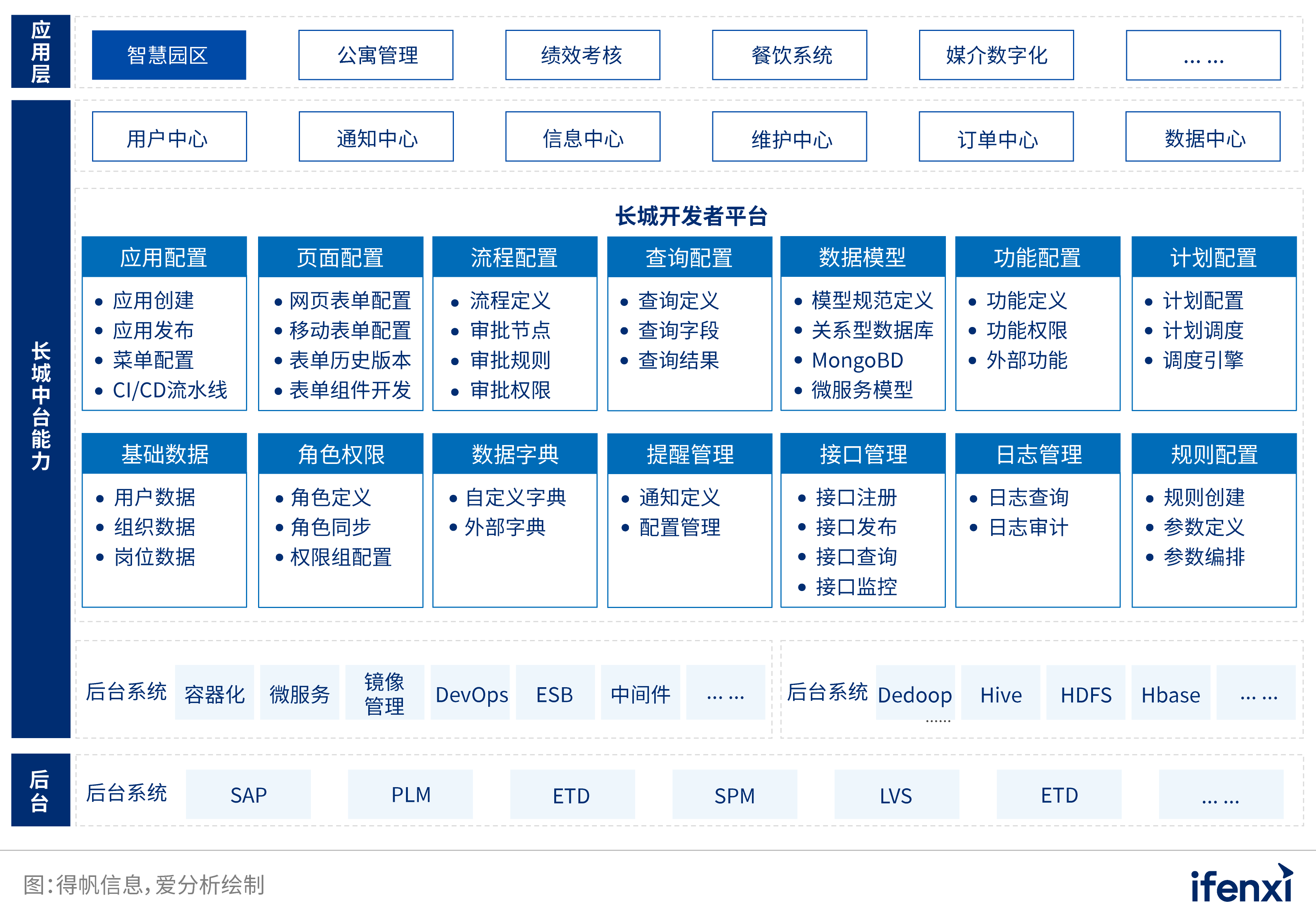 | 案例1:长城汽车借助低代码搭建“智慧园区管理平台” 长城汽车成立于1984年,是一家全球化智能科技公司,致力于服务全球用户的智能、绿色出行。为更好地顺应市场的变化,实现从中国汽车制造企业到全球化科技出行公司的转型,长城汽车搭建了业务、数据、AI三个中台,并不断引入先进数字化技术,优化项目管理流程与机制,进行数字化转型,打造智慧长城汽车。 以智慧园区为契口,助推智慧长城战略落地 随着中国制造业的转型升级,长城汽车已升级打造智慧长城战略,通过智慧制造、智慧物流、智慧园区、数字化运营,建设人、财、物全面协同的智慧信息系统,快速响应市场变化,实现生产、生活智能化。 为保证长城十余万人的正常生活、工作与娱乐,智慧园区是智慧长城战略的关键环节,为实现智慧园区的建设,在公寓、场馆、绩效考核、媒介数字化等方面产生大量呈点状分布、种类繁多的精细化管理需求,企业整体的数字化应用构建规划难以完全覆盖,也难以通过采购一套标准化管理系统来实现,因此,长城汽车决定先以用户体验要求高、需求量大的智慧园区管理为切入点,搭建智慧园区管理平台,后续逐步推广至智慧物流、智能制造等全集团智慧业务场景。所以必须打造一套长城汽车PaaS平台来承载整个智慧长城的战略,具体背景原因如下: 第一,数字化转型大规模推进中,敏态业务和长尾需求大量增加,需要有更为敏捷的数字化平台解决敏态和长尾需求。长城汽车在园区管理数字化转型过程中,大量的长尾需求需要转线上管理,且大量的业务需求也可能随时发生变化并需要及时调整,因此需要一套敏捷的数字化平台来高效地实现业务需求的快速迭代和长尾需求的快速上线。 第二,推进智能制造的同时,存在各类异构系统和各种复杂设备,各系统沉淀积累了超大工业数据量,但底层数据难以打通,逐渐形成数据孤岛,无法实现大规模边缘计算能力。长城汽车经过多年信息化、数字化建设,内部已经存在ERP、MES等各类系统和设备,但各系统和设备间因底层架构不同等问题难以实现数据的连接打通,导致企业对数据的利用难以高效进行,因此长城汽车亟需一套能够将各系统和设备之间数据进行打通的应用开发平台,实现企业大量数据的高效复用。 第三,“互联网+智造”时代,需要拥有公民级IT产品的构建的构架能力,业务部门可以自助实现和修改其所属的数字化产品。长城汽车IT人员不仅需要对如文娱系统开发这种复杂的场景需求进行开发,还需要满足如招聘的流程管理等简单的业务需求,任务冗杂且繁重。在开发人员有限的情况下,企业需要能够降低开发者门槛,让业务人员能够自行解决简单场景下的业务需求,释放IT人员的精力,去做更复杂更高价值的项目。 按照长城传统自研IT方式,需要招揽大量高级开发人员,产生极高的人员管理成本,但开发周期却又十分漫长。因此,长城汽车经过反复研讨,必须落地以智慧长城战略为基础的aPaaS平台,在多方调研的基础上,长城汽车最终决定选择用低代码PaaS方式进行平台运营,管理,开发。 在调研低代码平台厂商的过程中,长城汽车最为看重厂商的最佳实践案例、产品功能完整性、安全性、独立性、技术架构等因素,长城汽车IT专家曾表示“当时从低代码厂商中选择得帆,主要看重两点:一是得帆有丰富可参考的汽车整车企业实践案例;二是其产品的技术架构先进且性能优异,用户体验达到互联网级要求,能够与公司现有IT架构深度融合,符合公司未来对技术平台的趋势要求”, 因此,在进行长达半年严格选型和POC验证后,长城汽车最终选择得帆云低代码平台DeCod作为长城汽车的低代码底座PaaS平台。 得帆信息是一家低代码PaaS平台提供商,凭借在企业中间件领域的长期积累,为企业提供应用敏捷和数据集成的数字化解决方案,产品矩阵以自研的得帆云低代码平台DeCode和应用集成平台DeFusion为核心,还包括企业门户DePortal、主数据管理平台DeMDM和数据中台DeHoop。目前,得帆信息已经服务超过500家大型企业头部客户,其中《财富》500强128家,《制造500强》141家,落地超过1000多个项目,在汽车、制造、建筑地产、医药、金融等多行业均有丰富的头部客户实践经验,尤其是汽车行业,产品充分满足大型企业集团的复杂技术架构和复杂业务需求,已经实现了国内TOP10整车企业中七家的覆盖,稳居汽车行业低代码品牌领导地位。 得帆云低代码平台DeCod以模型驱动为核心,底层支持私有云、公有云、混合云等多云部署,具备容器化、DevOps、微服务等平台能力,提供应用配置、表单配置、分析配置、流程配置等无代码能力以及开放API、集成管理、前后端脚手架等低代码能力,敏捷兑现数字化需求的同时实现复杂应用定制和扩展,最终实现前台应用及管理功能的设计。 图 7: 得帆云低代码平台产品DeCod功能架构 借助得帆云低代码平台DeCod构建长城智慧园区管理平台,保障10余万长城人智慧化生活、工作、娱乐需求 长城汽车智慧园区管理平台基于得帆云低代码平台DeCod搭建而成,具备从需求、开发、测试、部署到运维的全生命周期的低代码快捷建设能力。后台系统能够对接SAP、PLM、ETD等多种企业管理软件,技术中台采用容器化、微服务、DevOps等技术,长城开发者平台具备应用配置、页面配置、流程配置等等功能,构建统一的用户中心、通知中心、信息中心、