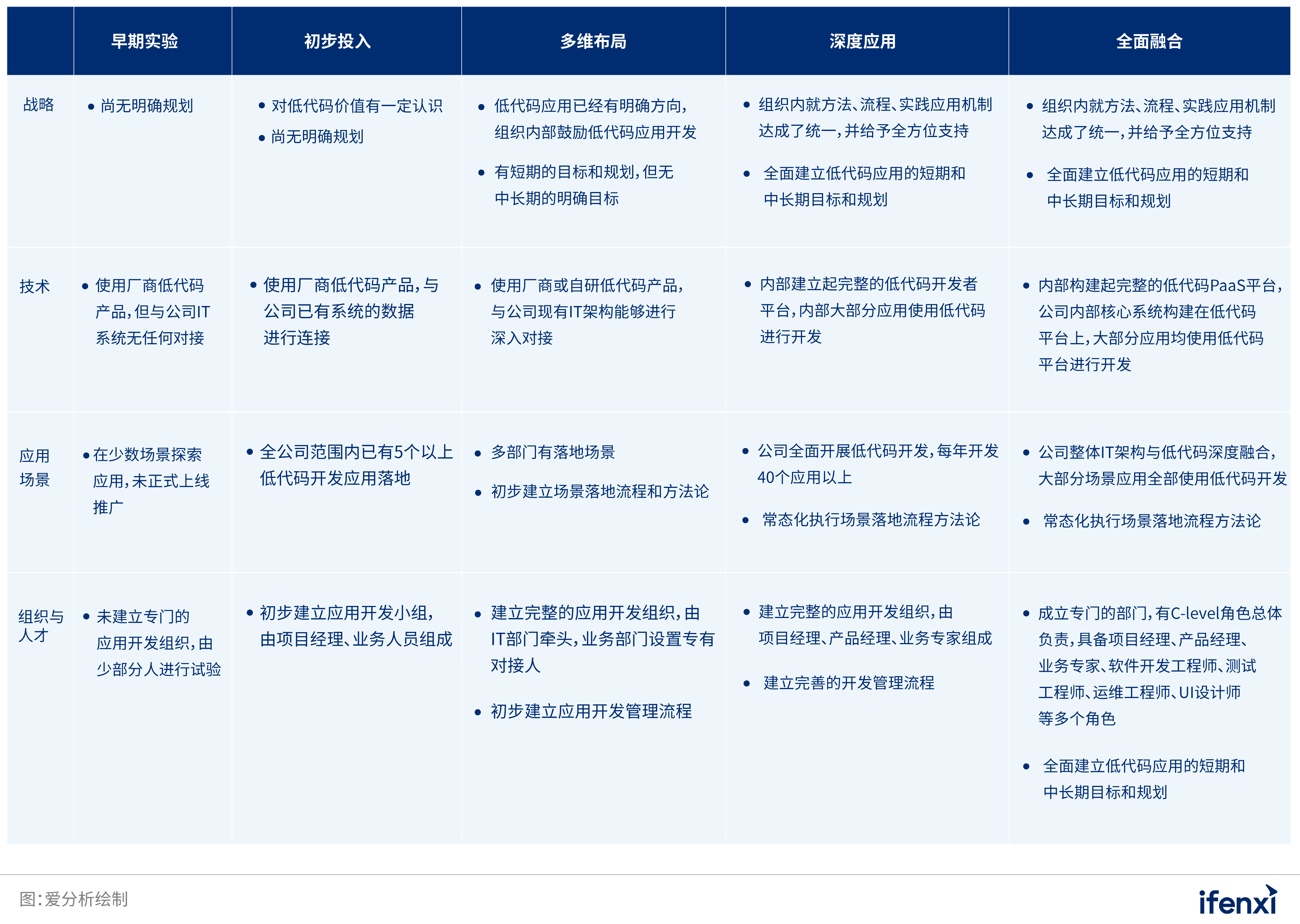 在本报告中,爱分析将低代码应用成熟度从低到高依次分为早期实验、初步投入、多维布局、深度应用、全面融合五个阶段,并从多个维度列举了每个成熟度阶段企业具备的主要能力特征,为企业自身成熟度评估提供参考。