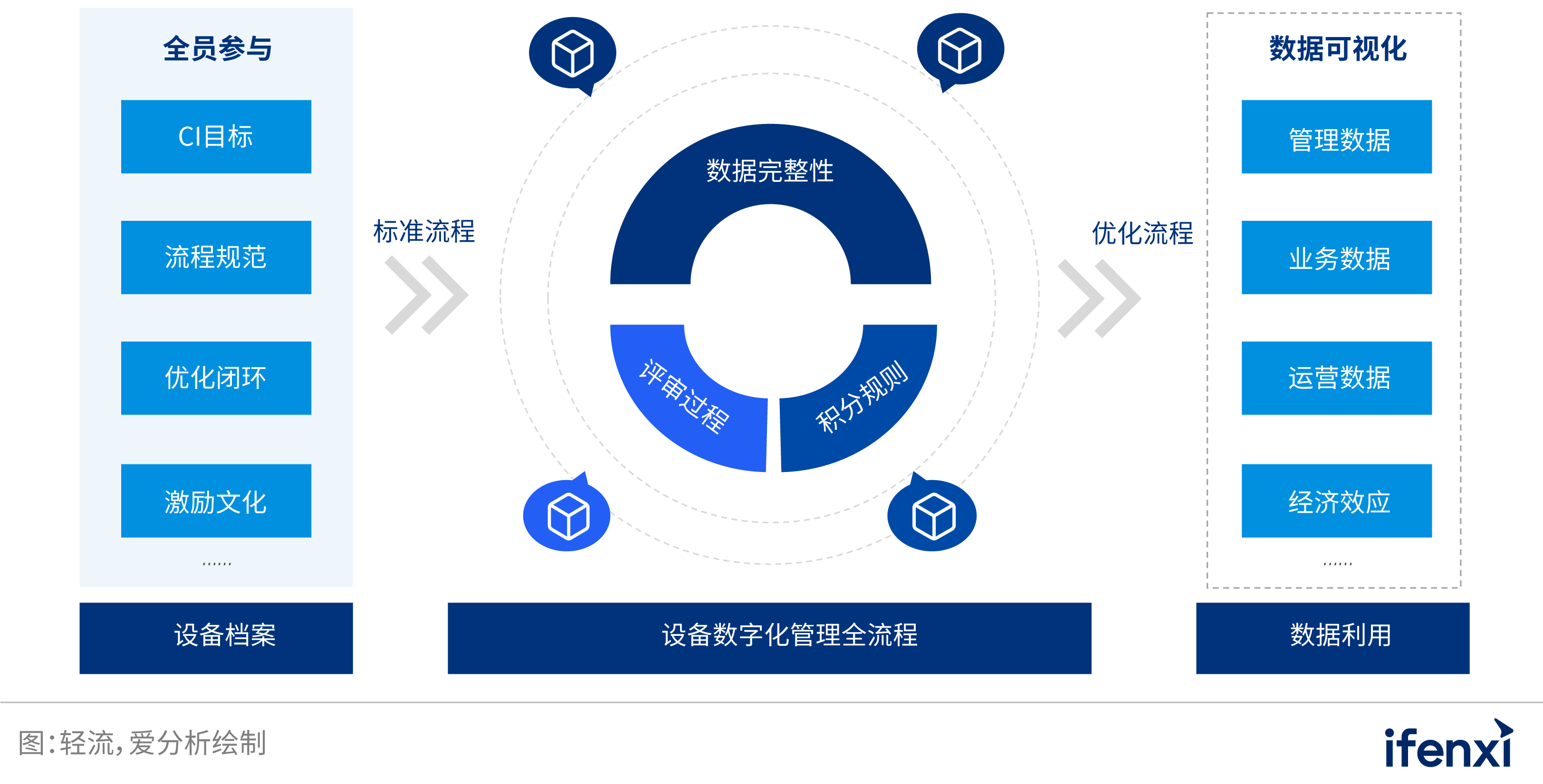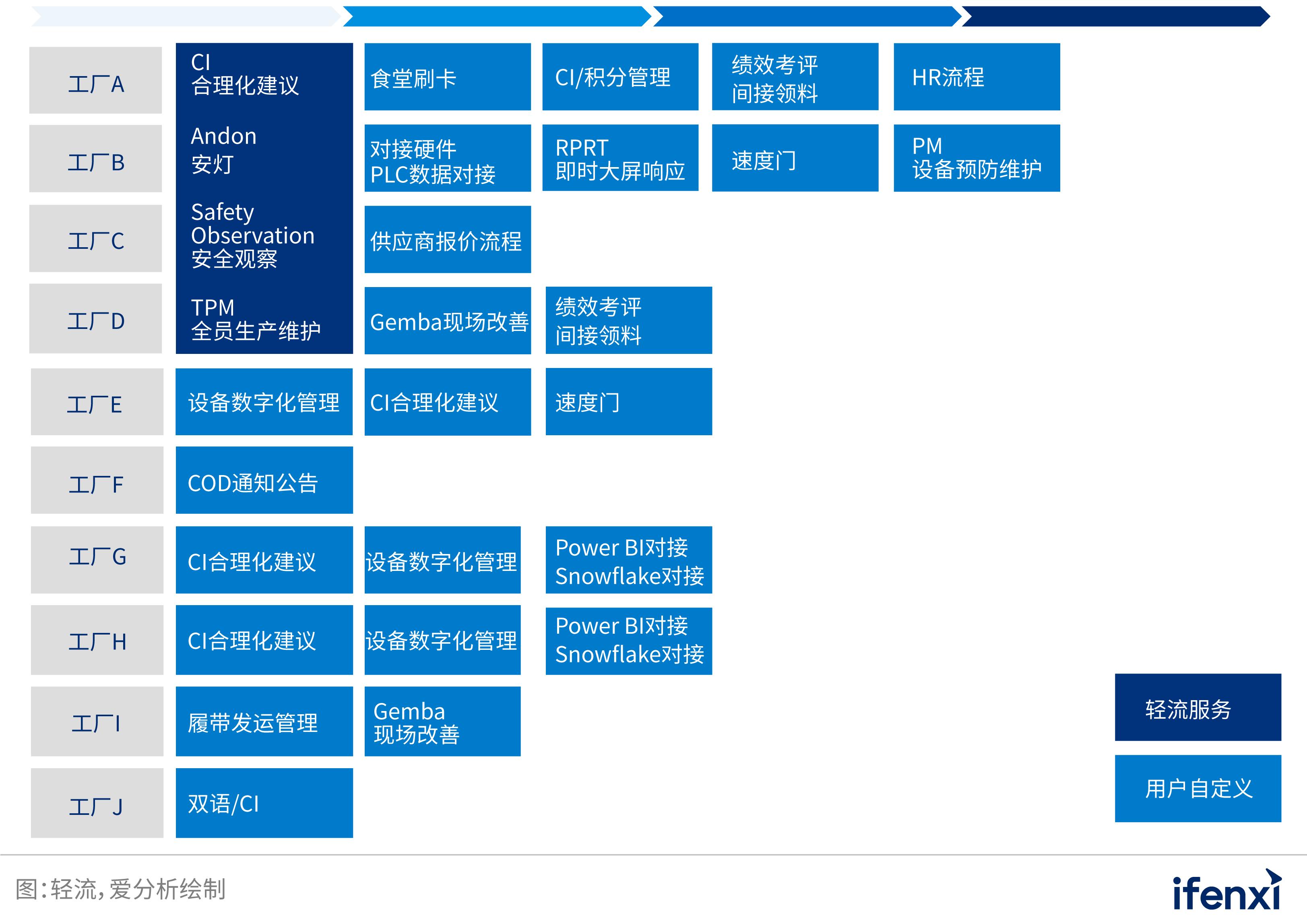 | 案例2:无代码助力某世界500强工程机械企业数字化管理 某世界500强工程机械企业成立多年,是建筑和采矿设备、柴油和天然发动机、工业用燃气轮机和柴油电力机车的全球领先制造商,在华共有近40家工厂与分公司,全球员工数超16万人。该企业为实现智能制造信息化发展,引入了大量的数字化管理系统进行业务赋能,提高生产与经营的效率。 以精益生产为切入点,实现全业务场景数字化管理,该企业产生三大需求 在管理流程自动化的战略下,该企业引入了SAP、微软在内的众多系统进行数字化管理,但对除生产管理、信息管理之外的业务场景仍未能全面覆盖,需要借助数字化工具全面完成管理自动化,实现精益生产。具体需求如下: 第一,协作效率低,需搭建协作平台,将业务流程线上化。该制造企业有众多工厂、子公司,但审批、材料填报等协作事项还需要在线下人工操作完成,效率低,企业需要搭建协作平台,将线下协作流程线上化,提高工厂与各公司员工协作效率。 第二,各系统独立存在,需打破壁垒,实现系统的互联互通。该制造企业拥有众多系统,但系统之间的账号与数据并未连通,信息流转效率低,企业需要打通已有的CWS、SAP、微软Power BI等系统以及工厂内物联网硬件,实现数据的全面收集、流通与分析。 第三,原有系统二次开发门槛高,周期长,需要能够支持业务人员进行高效自主开发。虽然该制造企业已具备较为完善的IT平台,但当新业务需求出现时,IT人员需基于原有系统进行二次开发,耗时长、成本高,企业需要拥有操作门槛低、能够敏捷开发的应用开发工具,让业务人员能够自主实现数字化业务需求。 通过多次尝试,最终选择轻流无代码应用搭建平台 为满足以上需求,该企业开始借助低代码平台进行尝试。由于该企业为美资企业,总部统一采购了低代码应用开发平台进行应用搭建,但由于该平台使用门槛较高,没有IT基础的业务人员难以使用,且该平台按照使用人数收费,基于成本考虑,中国区无法实现全员使用。基于此,该企业决定选择无代码应用搭建平台。通过综合考虑用户范围、使用门槛、易用性、敏捷性、产品能力的匹配度、性价比等因素,对多个无代码平台进行考察,该企业最终选择了轻流。 轻流(上海易校信息科技有限公司)成立于2015年,总部位于上海,在北京、广东、江苏、湖南等地均设有分支机构。轻流是一个无代码系统搭建平台,无需代码开发即可搭建专属管理系统。目前有超50万家海内外企业、政府机关单位等组织,通过轻流促进管理与协作。轻流可满足互联网、制造、零售、教育、工程建筑等数十个行业的系统需求;并提供企业资源管理、项目管理、订单管理、客户管理、人事行政等近百个业务场景数字化解决方案。 无代码应用搭建平台助力企业实现精细生产与精细管理 为了保证各工厂与公司员工充分利用轻流无代码应用搭建平台,整个项目推进分为系统对接打通、共同试点开发、内部自定义研发三个阶段。 首先,公司与轻流合作,将轻流无代码平台与总部CWS系统、公司内部SAP、PowerBI等管理系统以及PLC、IoT设备进行对接,实现全球超16万统一账号的打通,加快了数据的收集与流通。 其次,系统连接打通之后,公司与轻流共同合作进行试点搭建,选定4个工厂搭建了CI合理化建议、Andon安灯、Safety Observation安全观察与TPM全员生产维护等4个试点应用,在此过程中为各工厂与分公司培养了大量的种子用户,使其了解掌握了无代码平台各模块的功能、使用方法以及适用的业务场景。 最后,试点应用搭建完成后,4个工厂通过种子用户进行内部孵化,并联合轻流为工厂员工进行无代码应用搭建平台的使用培训。目前公司员工已经可以根据各部门业务需求搭建应用,已完成积分管理、HR管理、供应商报价流程、间接领料等应用的搭建。同时,其他工厂与分公司也开始对试点应用进行复用,并在工厂内部与公司内部进行无代码平台的推广。 目前,公司已在轻流平台上发布了100多个应用,包括设备管理、员工管理等多类应用。 图 9: 公司逐步落地的具体场景 典型应用场景1:安灯应用助力工人快速应对工厂异常情况 生产车间中灯的颜色往往反映设备的状态,如故障、缺料等事件,公司将设备上的IoT传感器与轻流平台连接,当传感器检测到异常或工人填报数据异常时,安灯应用会立即将数据传递给设备,从而控制灯的颜色,同时,还会向对应工作人员发送提醒,快速处理异常情况。 典型应用场景2:设备数字化管理应用保证设备良好运行 设备数字化管理应用中包括设备档案、点检巡检、维修保修、设备保养与备件管理5个功能模块。其中,设备档案由设备相关数据构成,工厂员工可通过扫二维码实时查看设备最新档案及关联业务流程。工作人员还可以根据不同设备类型,设置巡检计划、标准以及保养计划;根据问题类型,设置不同维修流程。当传感器上传的设备数据出现异常时,系统就会自动触发提醒巡检工人、维修工人或保养工人,保证管理工作有效执行。 图 10: 设备数字化管理应用流程图 典型应用场景3:搭建合理化建议CI应用,优化管理策略,实现持续改进闭环管理 为了让员工参与到公司管理当中,充分收集并合理化采纳员工建议尤为重要。合理化建议CI应用包括CI提交、建议评审、建议优化、积分激励、CI看板等板块,员工通过审核流程提交对生产过程