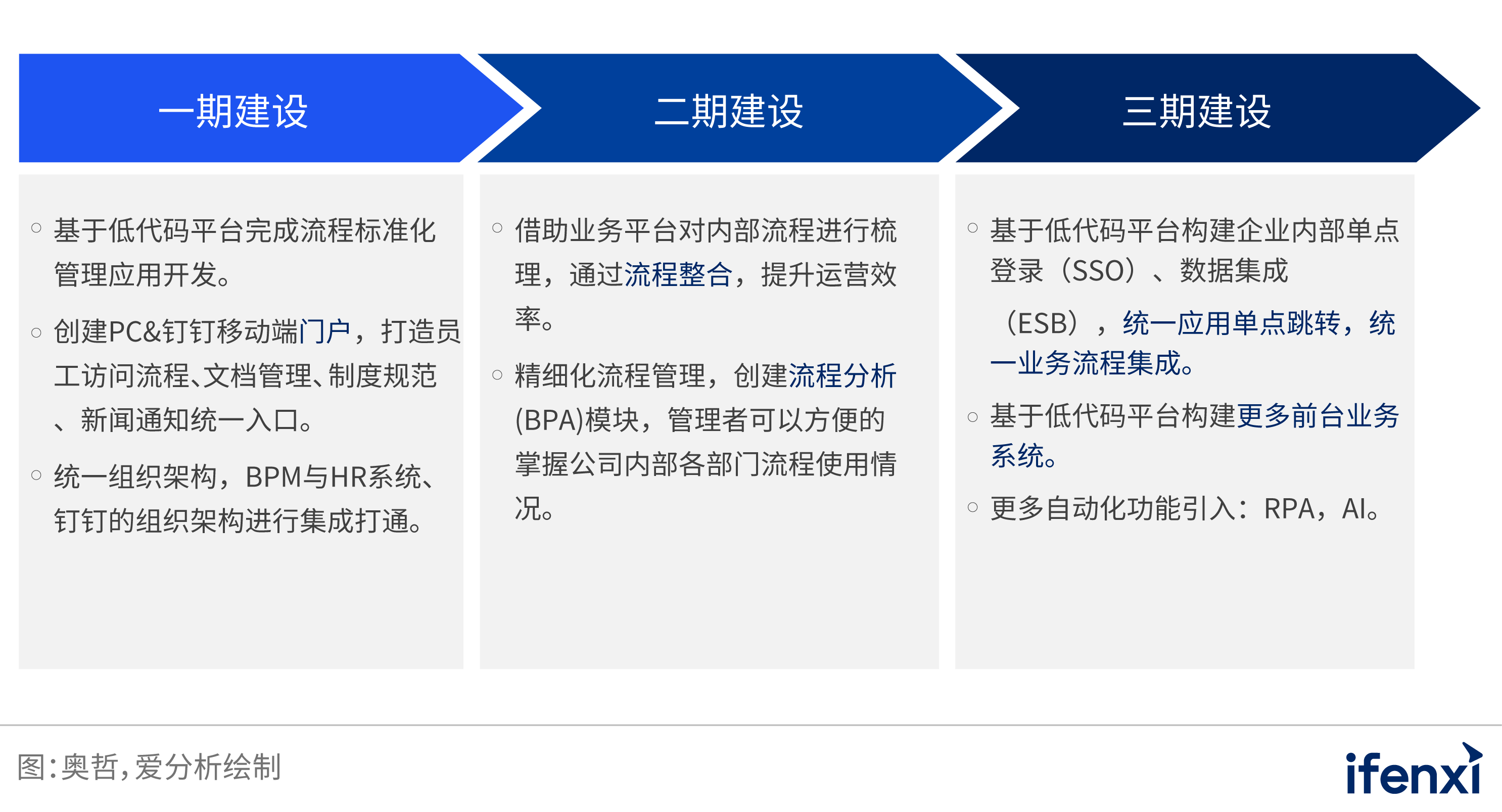 | 案例3:夕尔控股集团使用低代码平台搭建数字化综合管理中台 夕尔控股集团作为知名母婴品牌Babycare的母公司,采用互联网模式研究分析客户需求,根据客户喜好打造年轻化产品和品牌。旗下品牌Babycare秉承父母之心做产品,致力于打造全球母婴消费者可信赖的、忠诚度高的国际母婴品牌。其销售渠道涉及线上大部分主流电商平台以及线下连锁、KA、MALL等多通路,连续多年是天猫、京东等平台的行业TOP商家,并积极布局全球销售网络。 业务迅速扩张,夕尔控股集团精细化管理面临三大需求 近年来受疫情影响,夕尔控股集团的线上业务迅速扩张,集团员工总数也扩张至3000多人,且集团内部业务线多而复杂,需要借助数字化手段进行统一的精细化管理,具体需求如下: 各部门流程管理标准不一致,需搭建统一业务流程管理平台。夕尔控股集团内部业务线较多,有直播、供应链、采购、仓库、设计、店铺运营等多个部门,各部门为了高效办公,已经在钉钉平台上搭建了请假、审批等流程,各应用彼此独立,缺乏统一的标准,与企业管理体系脱节。因此,公司需要通过专业的业务流程管理方法,建设集流程设计、流程运维管理、业务集成、数据集成等内容于一体的业务流程管理平台。 集团已搭建多个独立的业务系统与应用,需要打通系统、集成应用,实现跨部门协同办公。夕尔控股集团内部已搭建了财务、报销、人事、ERP、OA等多个系统,各系统内含多个应用,但缺乏连接,无法实现资源的整合、灵活调用以及跨系统协作,且管理人员需要操作多个系统,流程复杂,耗时较长;企业需要将各系统打通,加快流程在各部门之间的运转,构建跨业务系统的端到端流程,并为员工提供统一办公平台,实现现有业务系统与应用的集成,提高办公效率。 以线上销售为主的业务模式带来多种日益变化的个性化需求,集团需要能够快速响应。作为以电商为主要销售渠道的企业,夕尔控股集团的业务模式与传统制造业、线下零售业不同,有大量日益变化的个性化业务需求,但目前市场上缺乏能够满足其所有定制需求的系统,厂商定制化开发的系统也存在二次开发困难、迭代速度慢的问题。因此,企业需要借助数字化手段,快速开发并更新个性化应用。 夕尔控股集团通过综合考量,最终选择奥哲低代码云枢平台 基于以上需求,夕尔控股集团决定搭建数字化综合管理中台(包括统一协同管理平台、统一流程平台、统一集成管理平台与统一移动办公平台),统一标准,打通业务系统,实现精细化管理。但考虑到定制化开发的系统开发周期长,成本高,需求迭代速度较慢,该公司决定选择具有高扩展能力,可快速迭代,能够通过拖拉拽组件、模块或编写少量代码快速进行应用开发的低代码平台。通过对安全性、集成能力、开发速度等因素的综合考虑,夕尔控股集团最终选择了奥哲低代码云枢平台搭建数字化综合管理中台。 奥哲·云枢是一款面向专业开发者的低代码应用开发平台,致力于为大中型企业解决复杂的核心业务需求。该平台采用云原生架构支持多样化部署,基于领域模型驱动开发支持可视化建模,提供可视化应用开发平台、应用服务平台、应用部署&管理服务和AI&大数据平台以及集成、组件市场,支持自定义研发素材的沉淀与复用。 奥哲低代码助力夕尔控股集团搭建数字化综合管理中台 经过奥哲与夕尔控股集团的多次沟通、需求梳理、方案汇报,最终决定建立数字化综合管理中台,包含流程管理、优化、集成,业务运营协同、业务财务一体化建设,项目整体逐步推进,应用系统持续优化。 图 13: 夕尔控股集团数字化综合管理中台建设整体规划 标准化流程管理,打通内部系统,建设一体化应用门户 夕尔控股集团与奥哲专家团队基于流程应用建设的零售行业经验以及流程固化、标准化文档等模版,梳理所需的流程类型,为各流程设立统一的标准,确定需要迁移、开发与合并的流程应用,明确流程搭建需求。流程的搭建分为三步:首先,开发人员基于云枢低代码平台提供的可视化数据模型、表单模型以及流程模型,通过拖拉拽配置组件、调整参数、设置流程节点等完成流程模型的搭建;其次,流程管理员创建测试用例,输入模拟参数之后即可完成流程的自动化测试,检验其流转是否正确;测试完成后,管理员对运行参数进行设置,并对流程版本进行管理,实现流程多版本共存,流程版本可追溯等。 图 14: 夕尔控股集团数字化综合管理中台功能架构蓝图 流程搭建完成后,利用云枢的集成能力,通过webhook、OpenAPI等方式与夕尔控股集团内部除财务系统以外的ERP、资金、采购、HR、OA等内部系统进行连接,打破不同部门、不同系统之间的信息壁垒。同时,将各流程无缝集成到钉钉平台中,流程所发起的任务通知也可以与钉钉工作通知以及代办事项集成,点击即可跳转处理。 此外,夕尔控股集团还通过云枢低代码平台的UI设计器、模型设计器等创建了PC&移动端门户,打造员工访问流程、文档管理、制度规范、新闻通知等统一入口,极大地提高了员工工作的便捷程度。 打通财务系统,优化业务执行流程,完全实现业务贯通 夕尔控股集团已经自主搭建24个财务模块付款流程,但其实现逻辑简单,无法满足企业业务的特殊性需求,且各流程的入口不统一,操作流程复杂。为实现业务系统间数据、流程的协同、互通,构建成本、资金流的可