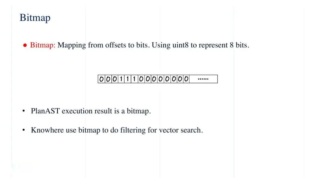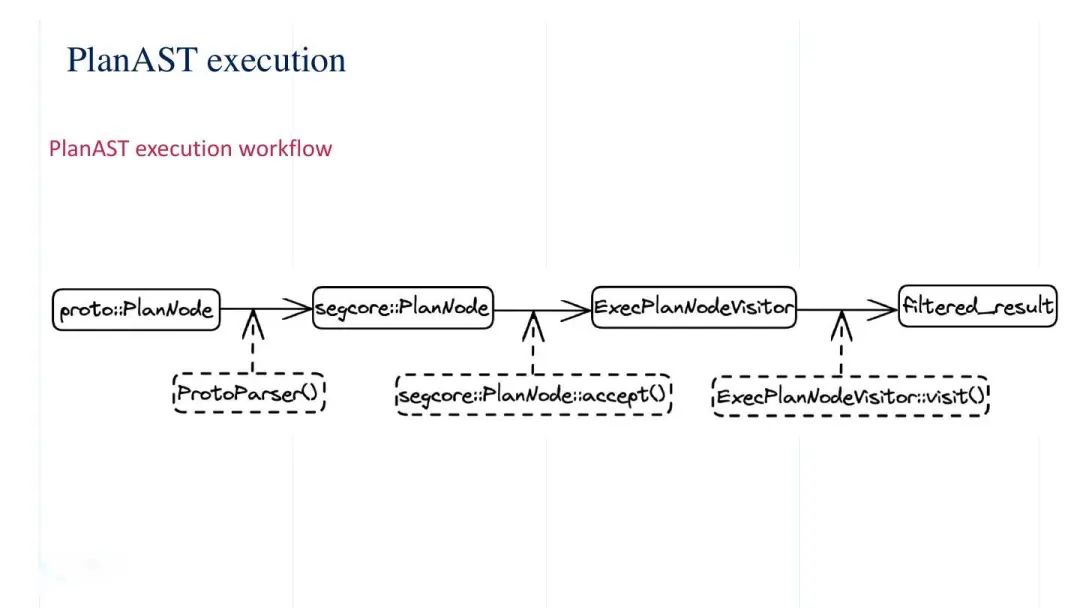 上图总结了查询语法树执行的工作流程。首先从 C++ 接收到一个 proto 类型的 PlanNode,经过 C++ 内部的 ProtoParse 得到 segcore 类型的 PlanNode。在此基础上,通过 accept 的方法接受一系列的访问者类,再对 PlanNode 内部的结构进行修改、执行。最后对每个具体的ExecPlanNode进行递归遍历,得到过滤的结果 Filtered_result,以下图的Bitmap作为具体形式。