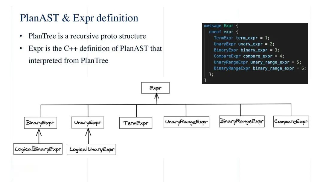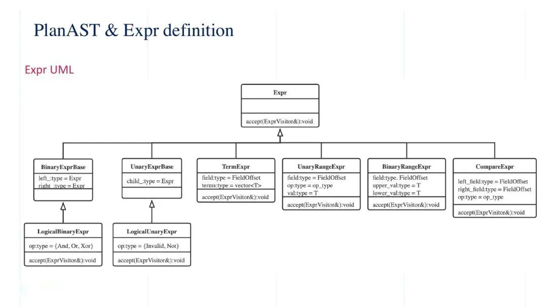上图为表达式的一个 UML 的图,是 C++ 中根据 proto 结构去实现类的继承关系结构图,包含各个 Expr 的基类与派生类。每个类下面都实现了一个 accept 的方法,接受的是 visitor 的参数。这就是典型的访问者设计模式(Visitor design pattern),以此对前面生成的查询语法树进行遍历的执行。这一模式的优势在于用户不需要对 Expr 原始进行操作,可以直接通过访问的方法对其中一些具体的类与元素进行修改。