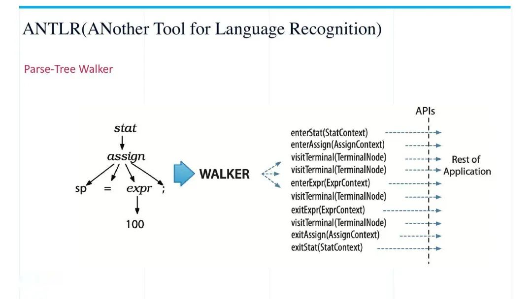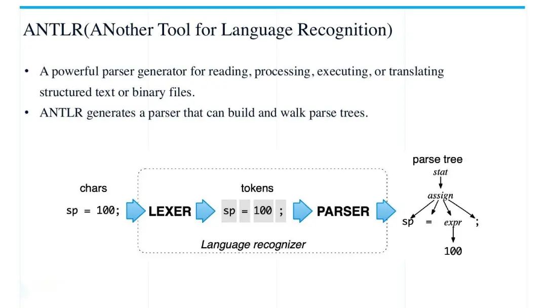 ANTLR 可以理解为解析器或者生成器,它能够对结构化文本或者二进制文件做读处理,包括执行和翻译的过程。具体来说,ANTLR 可以根据定义的文法规则进行解析,也可以生成解析器来构建解析数;同时它内部也提供了 WALKER 的一些 API,可以帮助遍历解析数。例如图中的表达式 “SP =100;" ,ANTLR 自带的语言识别器 LEXER 会生成四个 token,再各自进行解析生成 Parse-Tree。