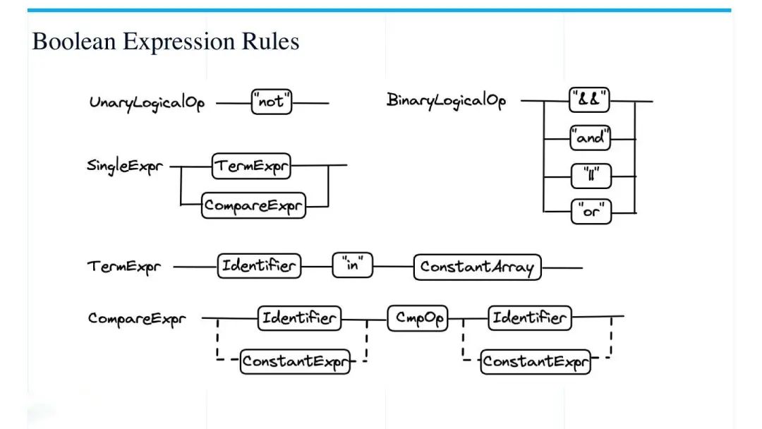 表达式 LogicalExpr 有四种组合来进行表示,比如通过二元的逻辑运算符,在逻辑表达式前加一元的逻辑运算符,或者用一些比较简单的 Single Expr 等。