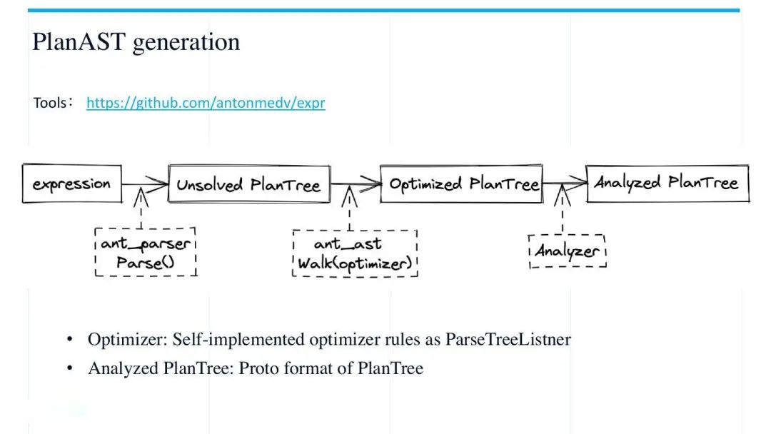 最后一个这个虚线节点的 analyzer 过程是将已经优化好的 Plantree 进行递归遍历分析。在二叉树的遍历过程中,每个节点对应到定义的 protobuf 的语法树的结构,进而生成一个 protobuf 结构的一个 plan AST (abstract syntax tree)。