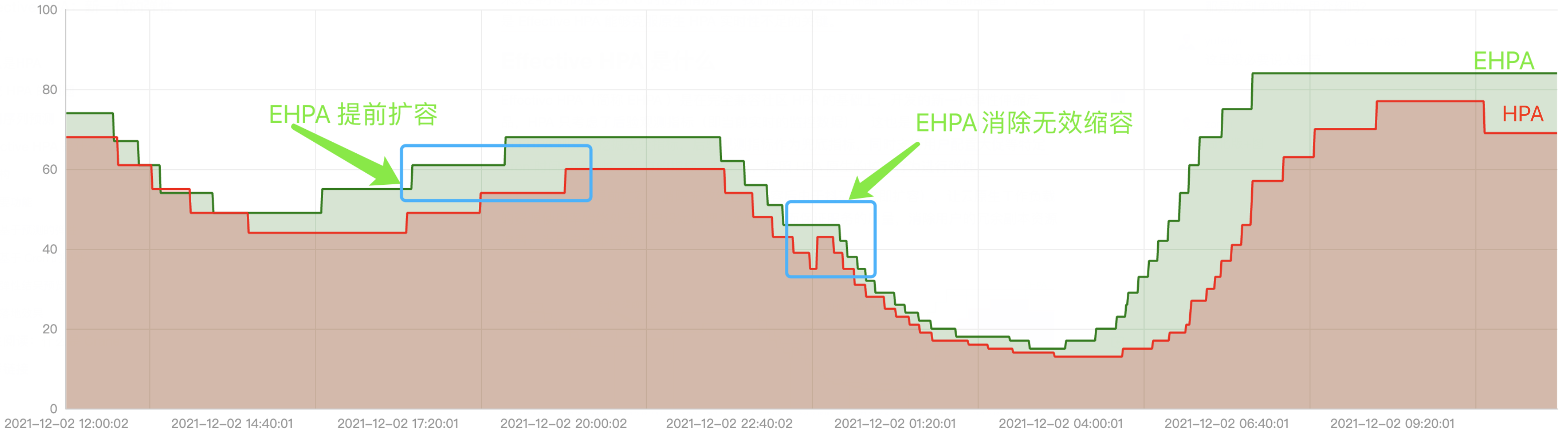这样当未来流量上升超过 HPA 容忍度的时候,HPA 就可以在当下完成提前扩容,而当未来短时间内有流量降低,但是其实是短时抖动,此时由于 EHPA 取最大值,所以并不会立即缩容,从而避免无效缩容。