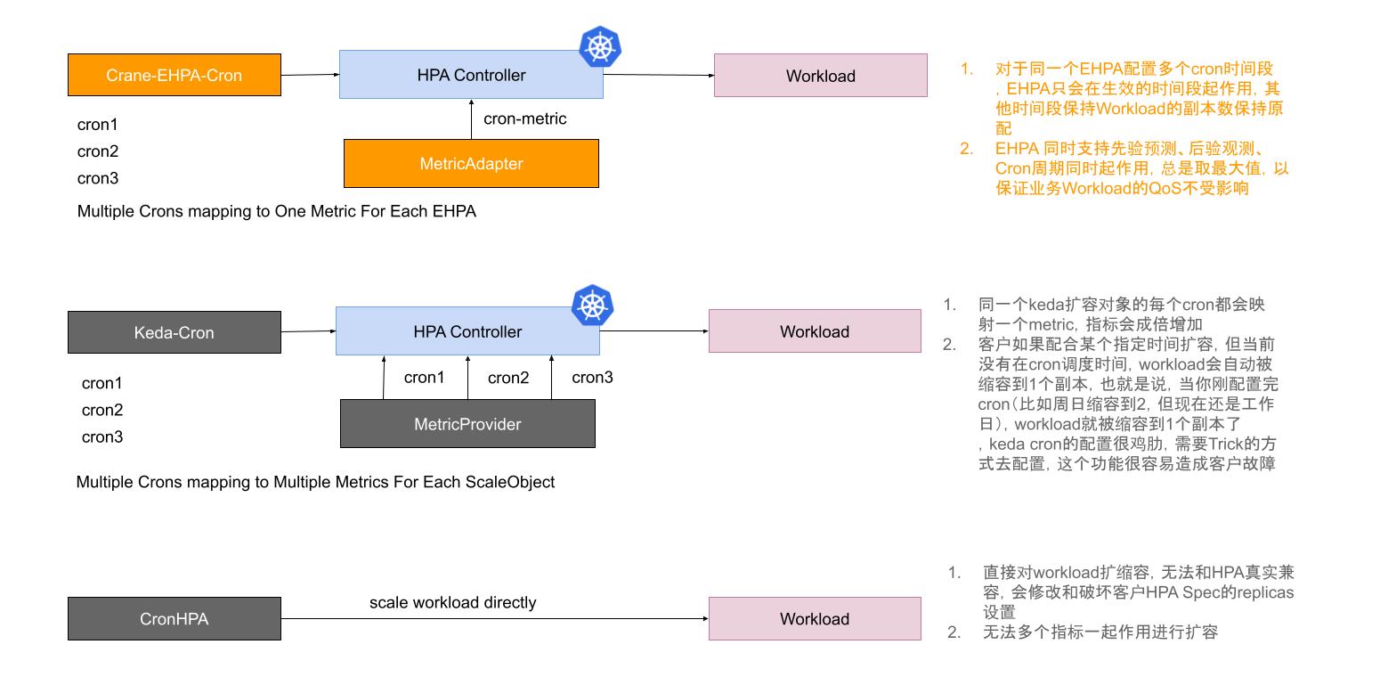 下图是当前 EHPA 的 Cron 弹性实现和其他 Cron 能力对比: