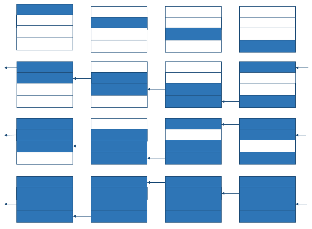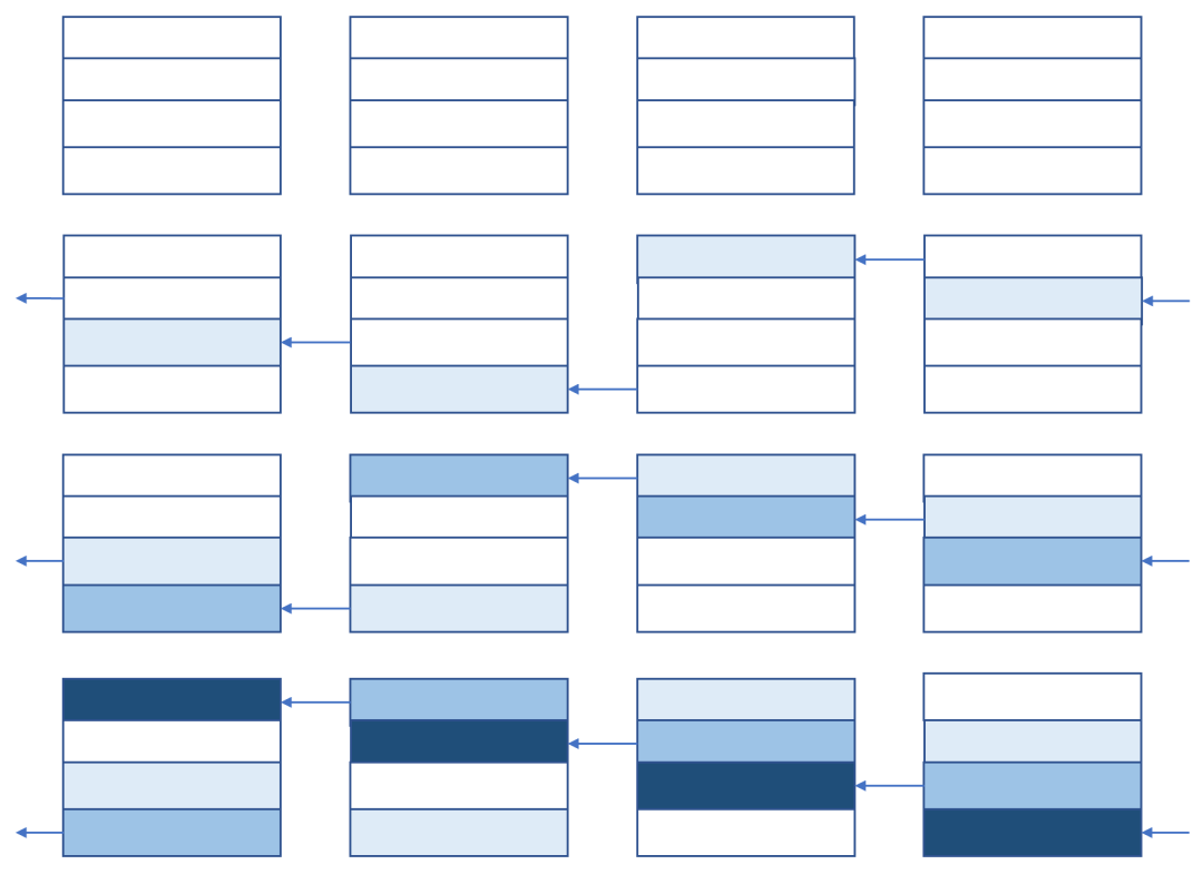 图 4 给出了环状 all-gather 的实现过程,我们就不详细描述了,值得注意的是,它的通信时间和通信量的分析与 reduce-scatter 一模一样:整个过程需要的时间是 ,如果 p 足够大,完成时间近似为