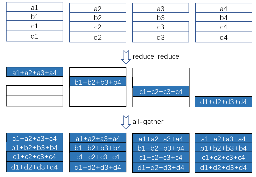 图 2:使用 reduce-scatter 和 all-gather 实现 all-reduce