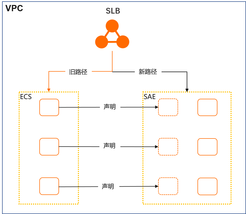 SAE 支持与云主机(ECS)实例进行混部,以便于在存量迁移的场景下实现快速弹性,发挥 SAE 的优势,整个过程无需任何开发改造。具体的方式为,将存量 ECS 实例加入到 SAE 实例声明使用的 SLB 后端虚拟服务器组中,SAE 应用在部署、扩缩容、停止、启动、重启、垂直扩缩容等场景中,会自动动态维护 SLB 后端的实例,统一对外提供服务。