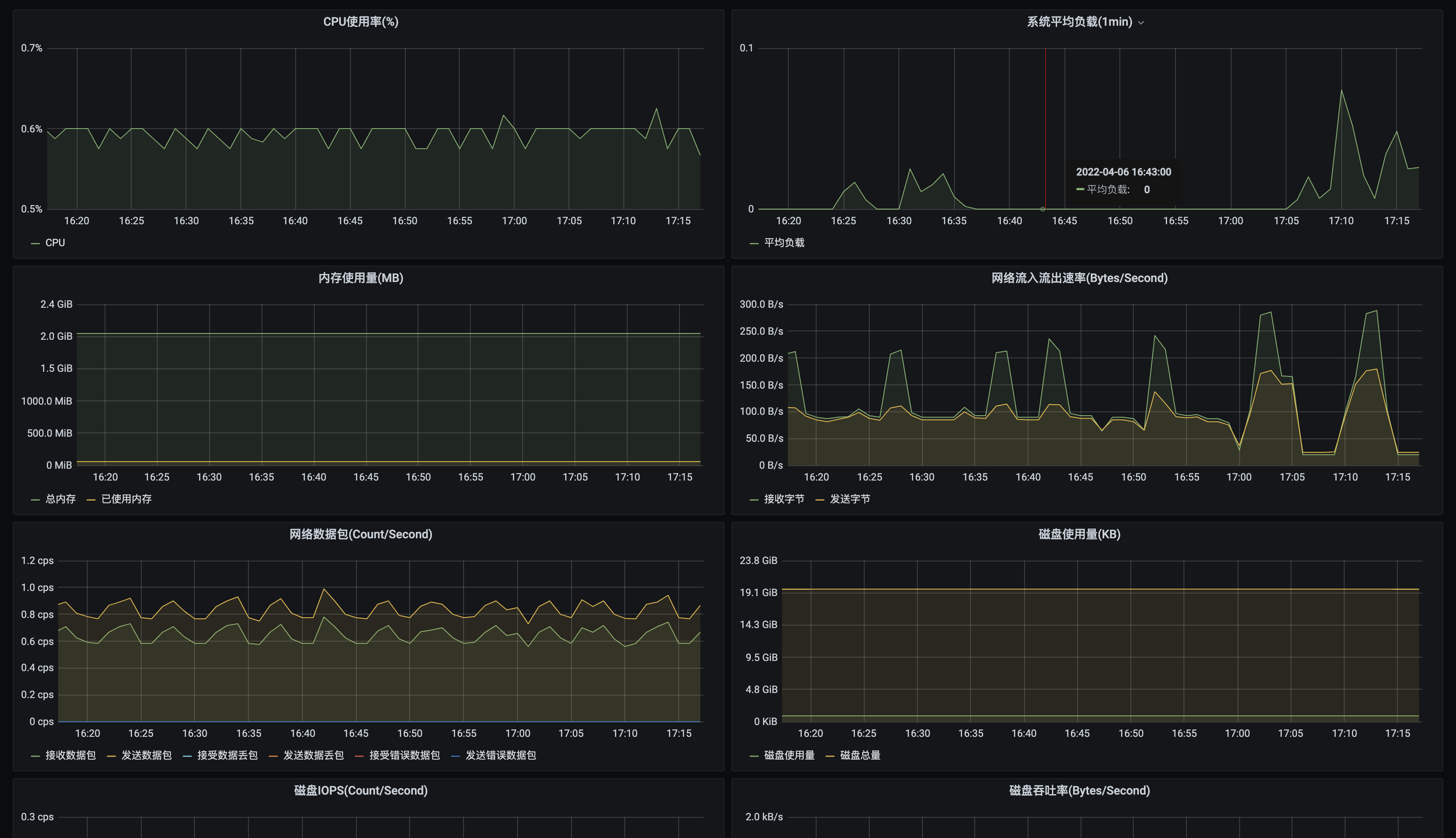 SAE 对应用所运行实例的 CPU、负载、内存、网络和磁盘进行数据采集与分析,并能够以动态图的方式展示,方便用户实时、且直观地了解到应用运行设备的状态。采集的数据会预制在 Prometheus 中,并配置集成可视化大盘。用户可以通过 Grafana 进行自定义大盘的配置。