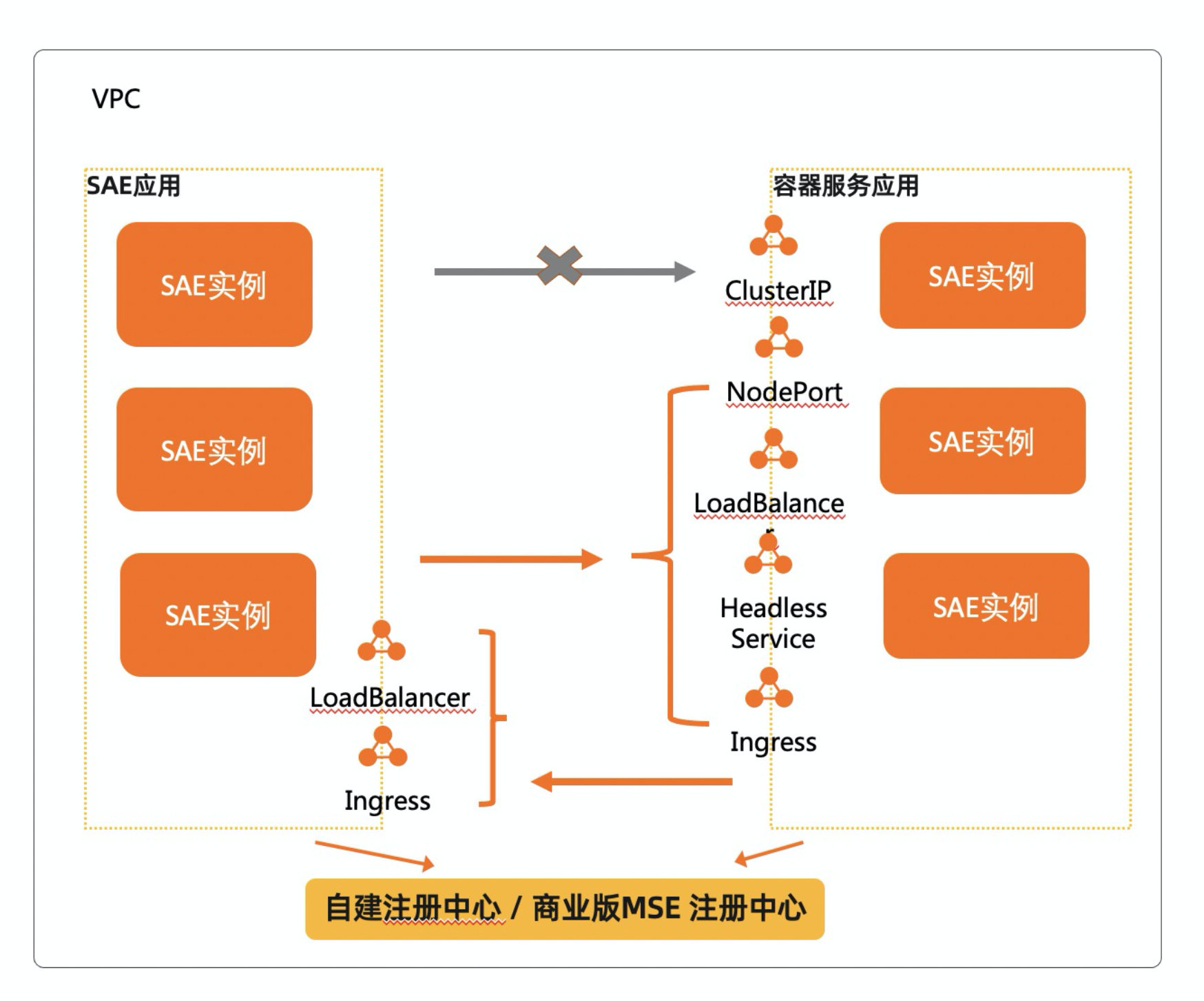 SAE 支持与 Kubernetes(ACK) 进行流量互访,借助公网 SLB/Ingress ,或者相同 VPC 下私网 SLB 协同 PrivateZone 内网域名解析的能力,暴露应用服务地址;亦或在微服务场景下采用同一注册中心,均可实现在不变更原有架构的基础上,进行 SAE 实例与 Kubernetes pod 的通信与交互。