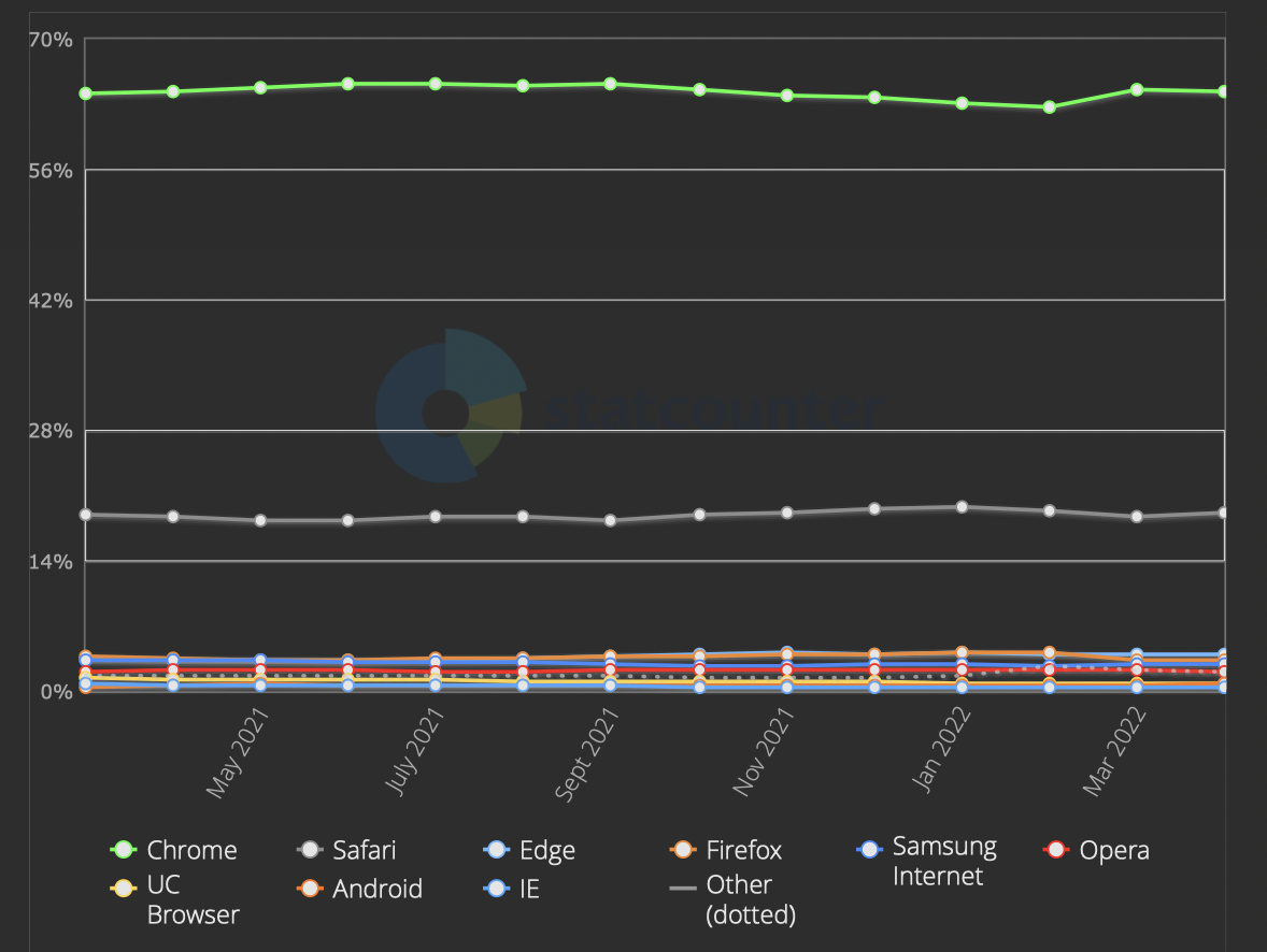 根据市场研究机构 Statcounter 截止 2022 年 4 月的统计数据,基于 Chromium 的 Microsoft Edge 浏览器在桌面端的市场占有率超越了 Safari,排名仅次于 Chrome 浏览器,成为了桌面端第二大浏览器,而 Chrome 的地位仍无法撼动,占据主导。