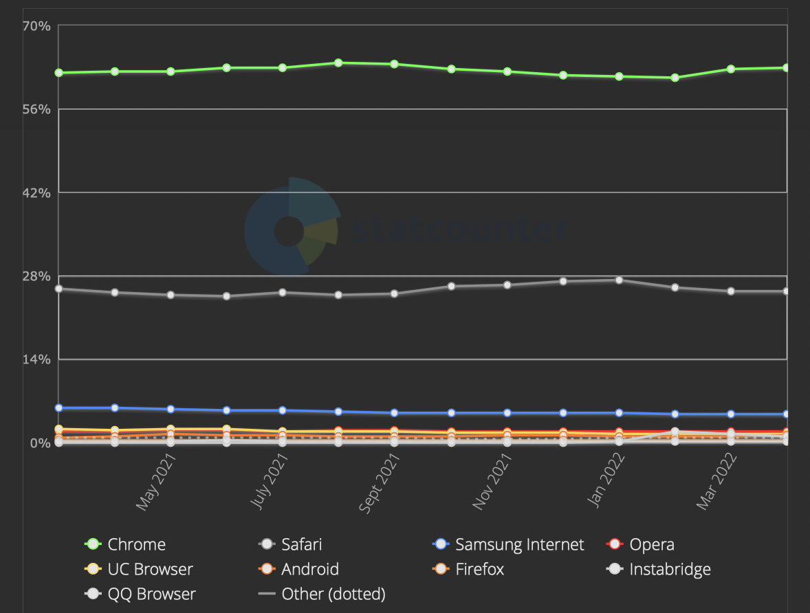 当我们把目光放回手机和平板电脑端时,我们甚至无法看到 Edge 浏览器的身影。由于 Google 和苹果掌握着 Android 和 iOS 两大移动操作系统,Chrome 和 Safari 自然而然就是移动端排名第一和第二的浏览器,分别占据了 62.91% 和 25.36%,两者市场份额相加后约为 88.3%,留给其他浏览器的份额已所剩无几。三星作为全球最大的手机厂商,其每年的手机出货量稳居榜首,这也为自家手机内置的浏览器带来 4.7% 的市场占有率。
