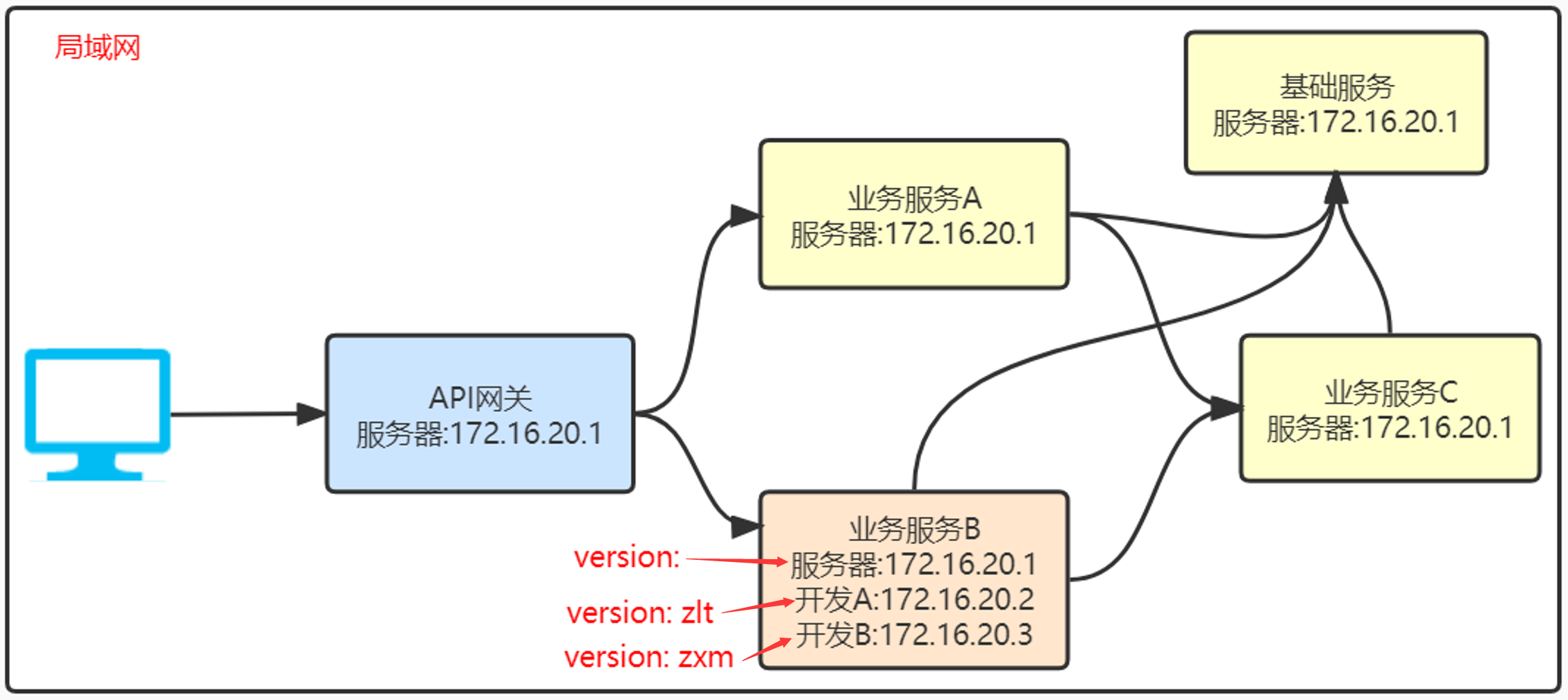 这样如果 开发A 本来想要调试自己本地服务的时候,网关调用业务服务B时的请求则有可能会跳转到其他人的实例上,如服务器上的或者开发B的实例。