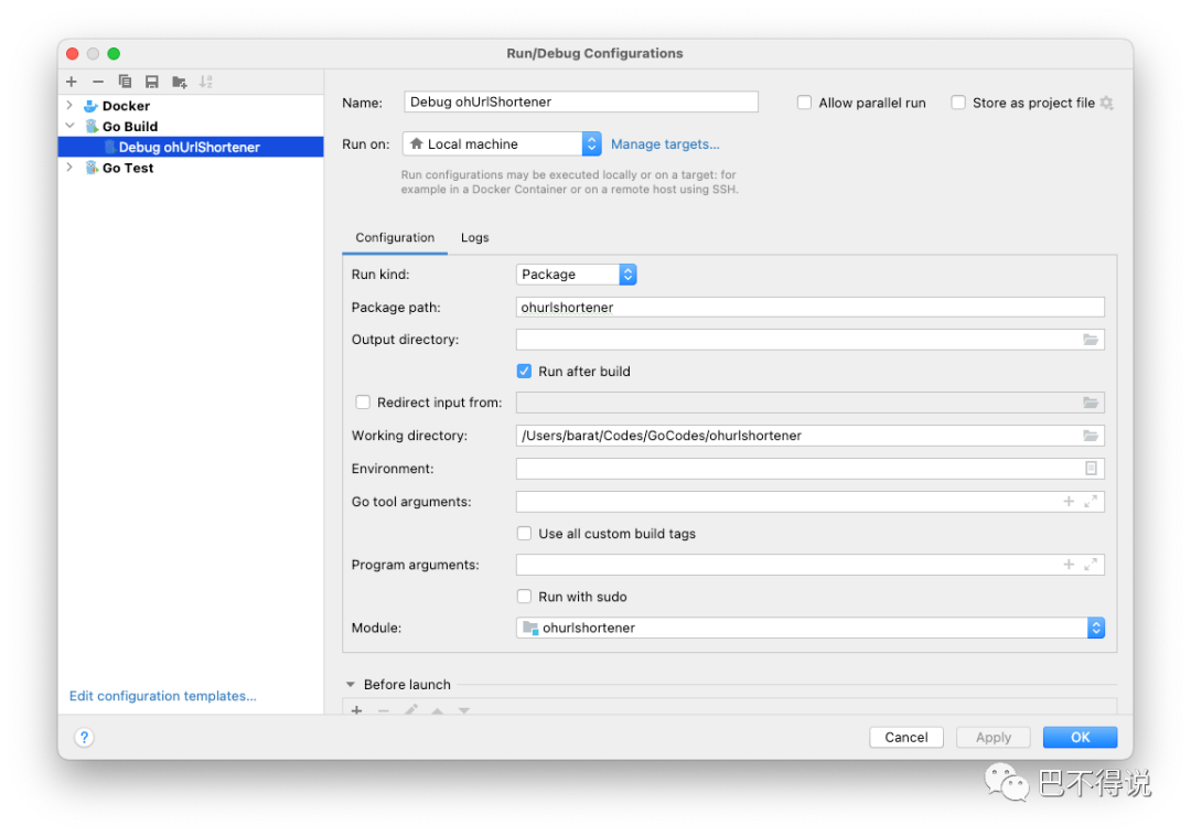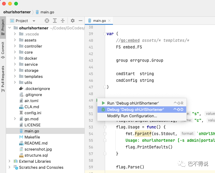安装完成之后,在项目根目录执行 air init 命令,可初始化 air 配置并生成默认配置文件,其内容可参考 ohUrlShortener 项目使用的 air 配置: