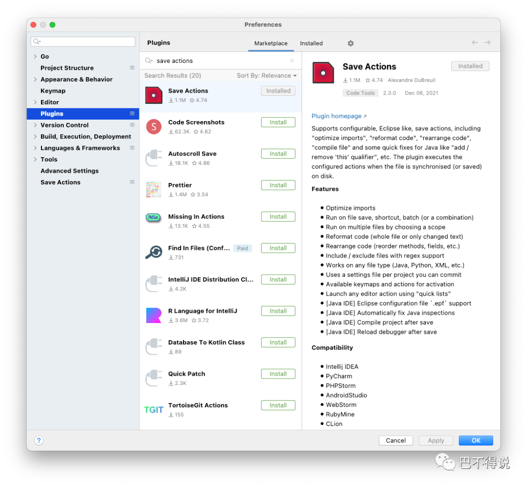 在插件中心,搜索并安装「Save Actions」插件。可以看到该插件的说明中,其实并不包含对 Goland 的支持。但实践过程中发现,该插件能很好的运行在 Goland 环境中。